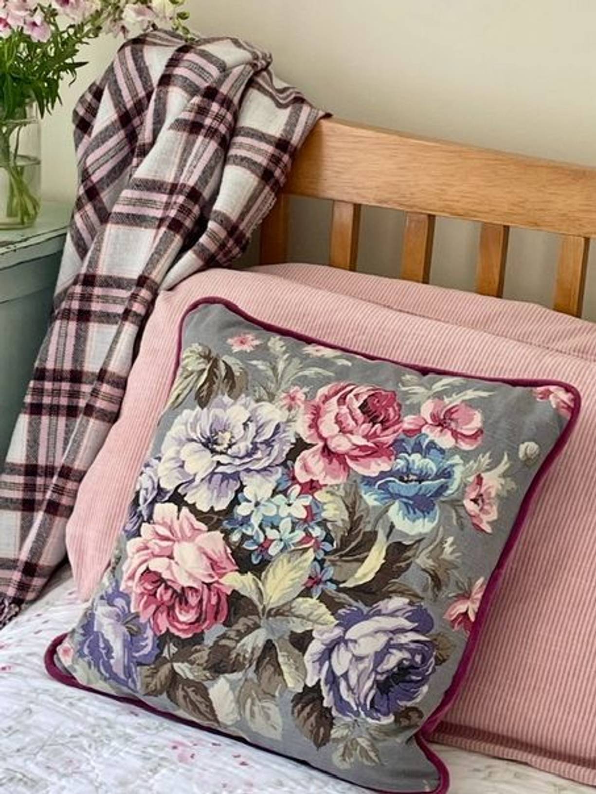 Beautiful blowsy blooms in pinks, blues and violets on a smokey grey ground, a classic vintage Sanderson print backed with raspberry cotton velvet. A unique hand crafted cushion cover 16” square with a piped edge and zip closure, in excellent clean condition.