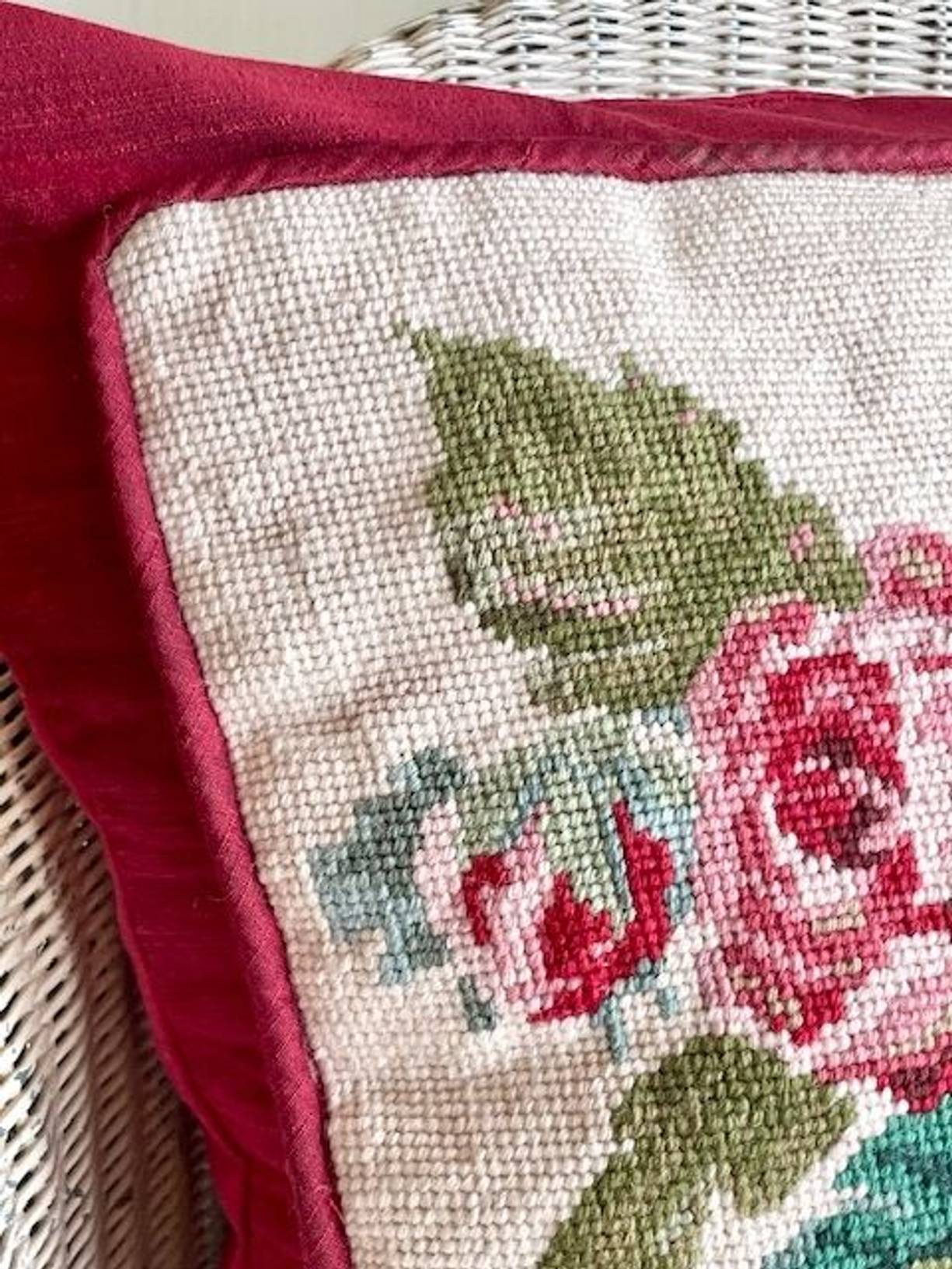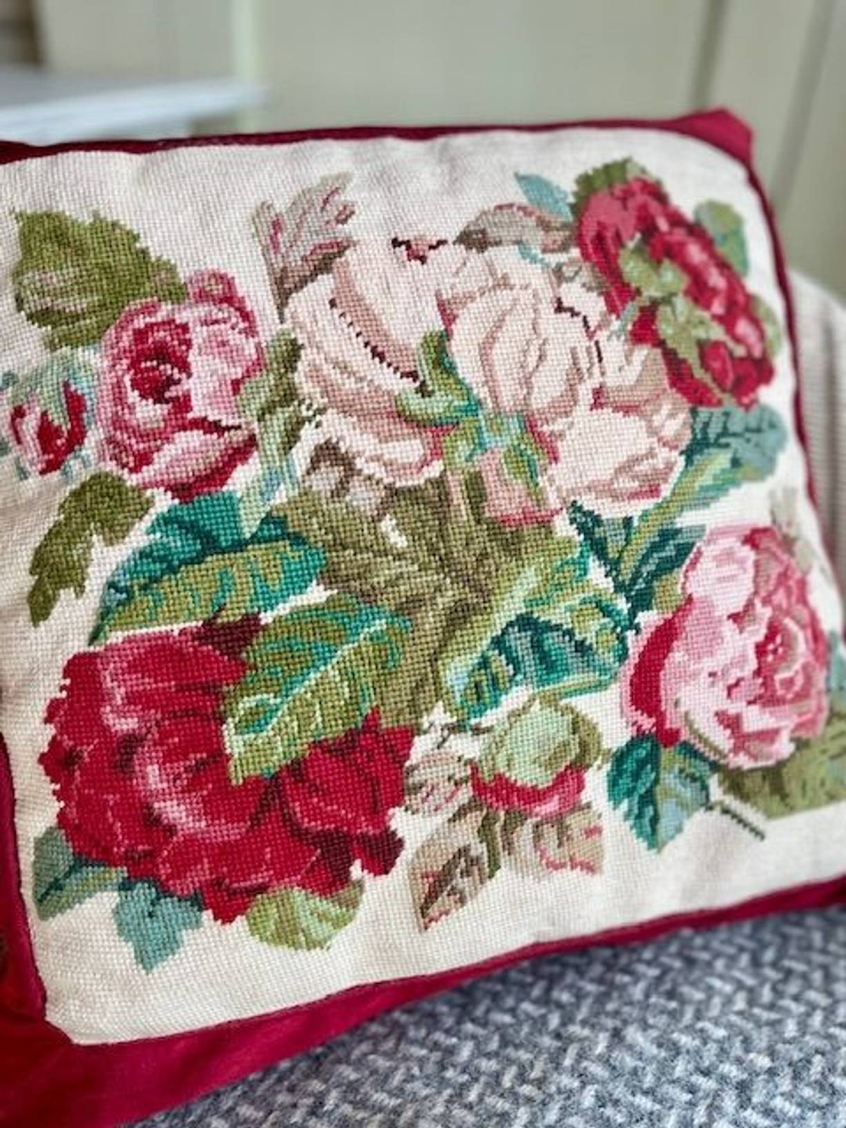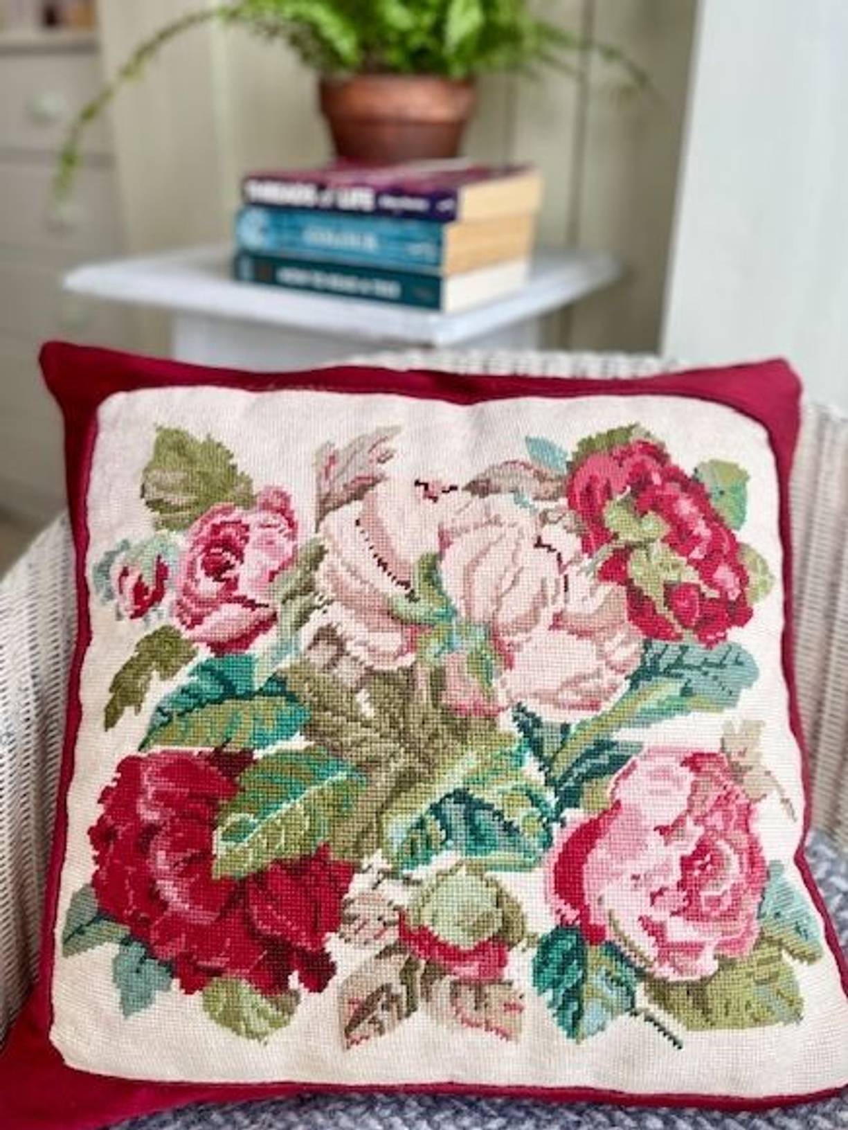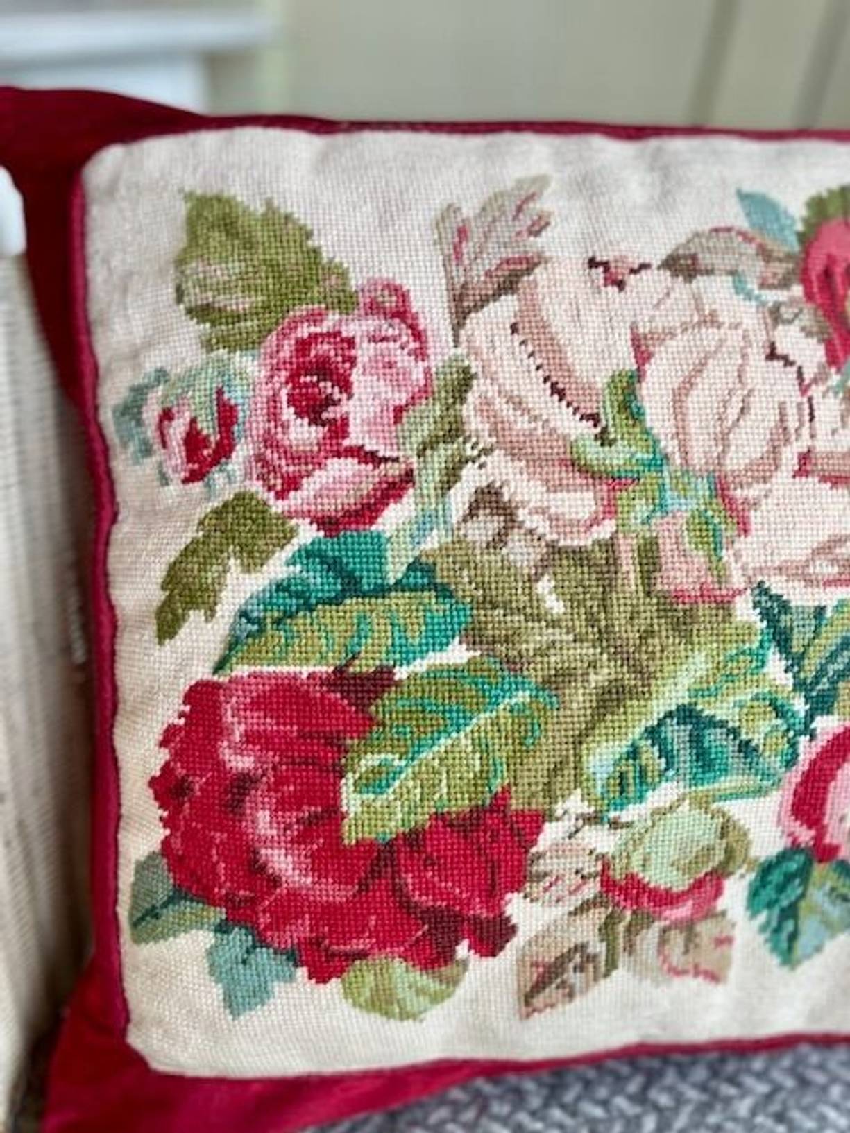 A vintage wool tapestry cushion with gorgeous pink and red roses, edged in red with a toning soft cotton backing, a handmade plump feather cushion 18” x 18” with a zip closure. In really good condition, a lovely vintage textile to add texture and colour.