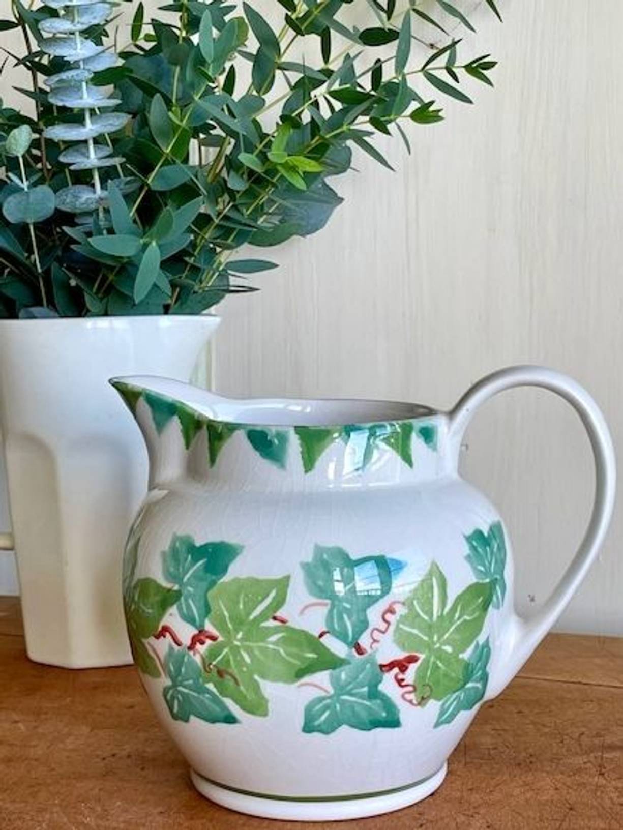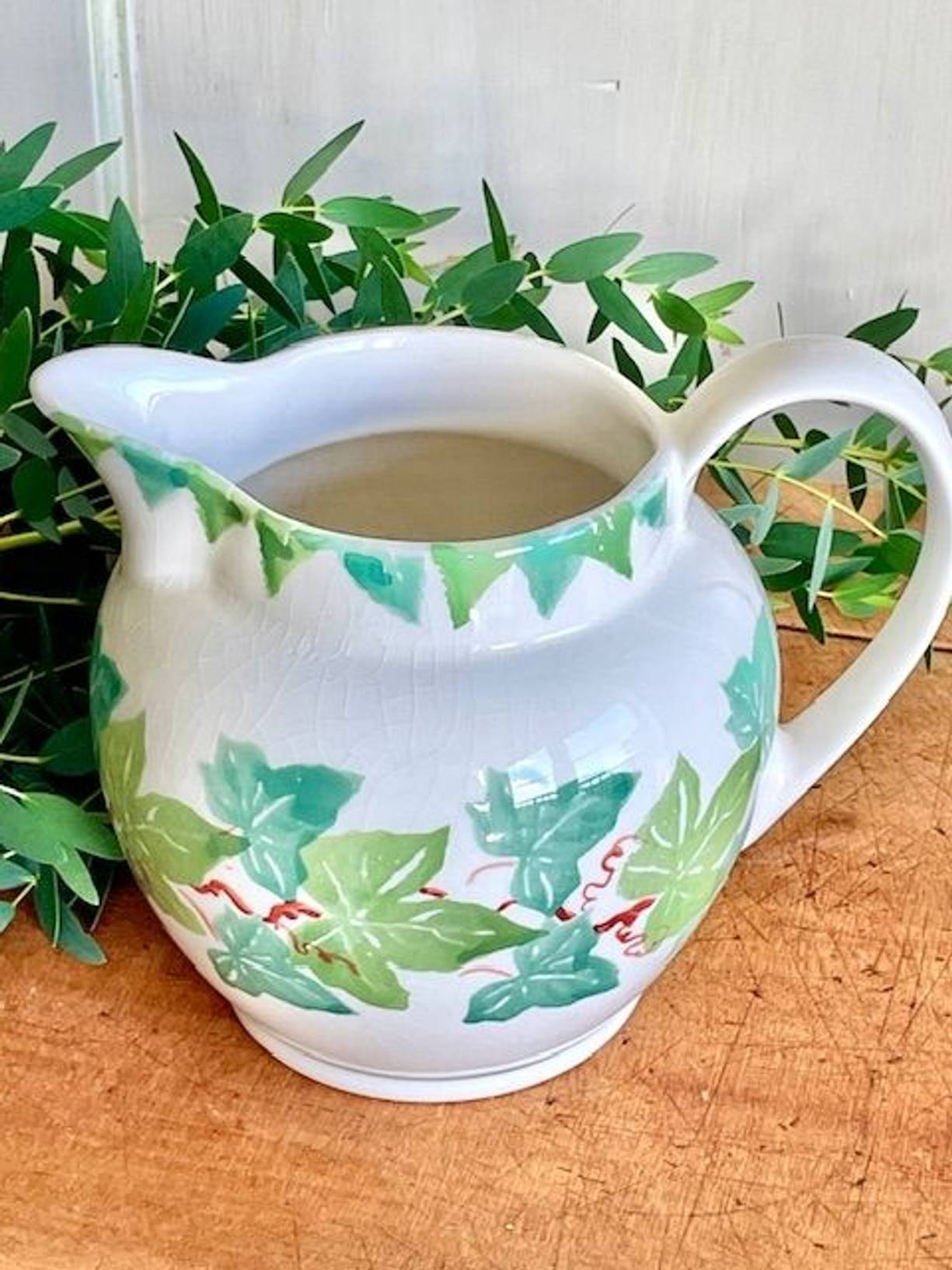 A charming hand decorated country style ceramic jug with vine leaves all around, crafted in Burslem, Staffordshire by Moorland Potteries. A useful larger size 1.5 litre jug standing 6.5” tall, it is a sturdy and fairly heavy piece and is in lovely condition, clean inside with no damage, just crazing commensurate with age. A attractive country vintage piece to use and display, and a useful seasonal vase.