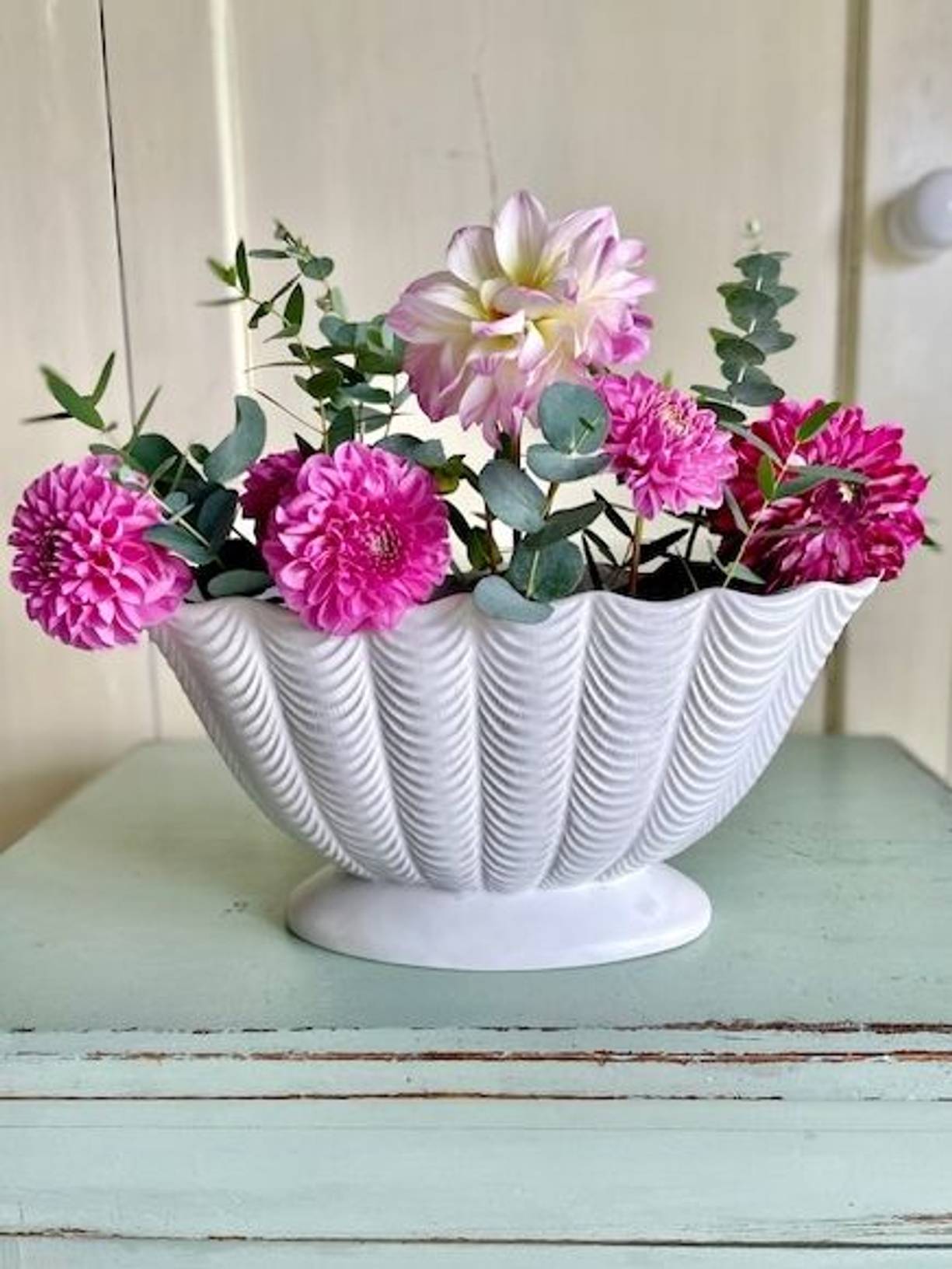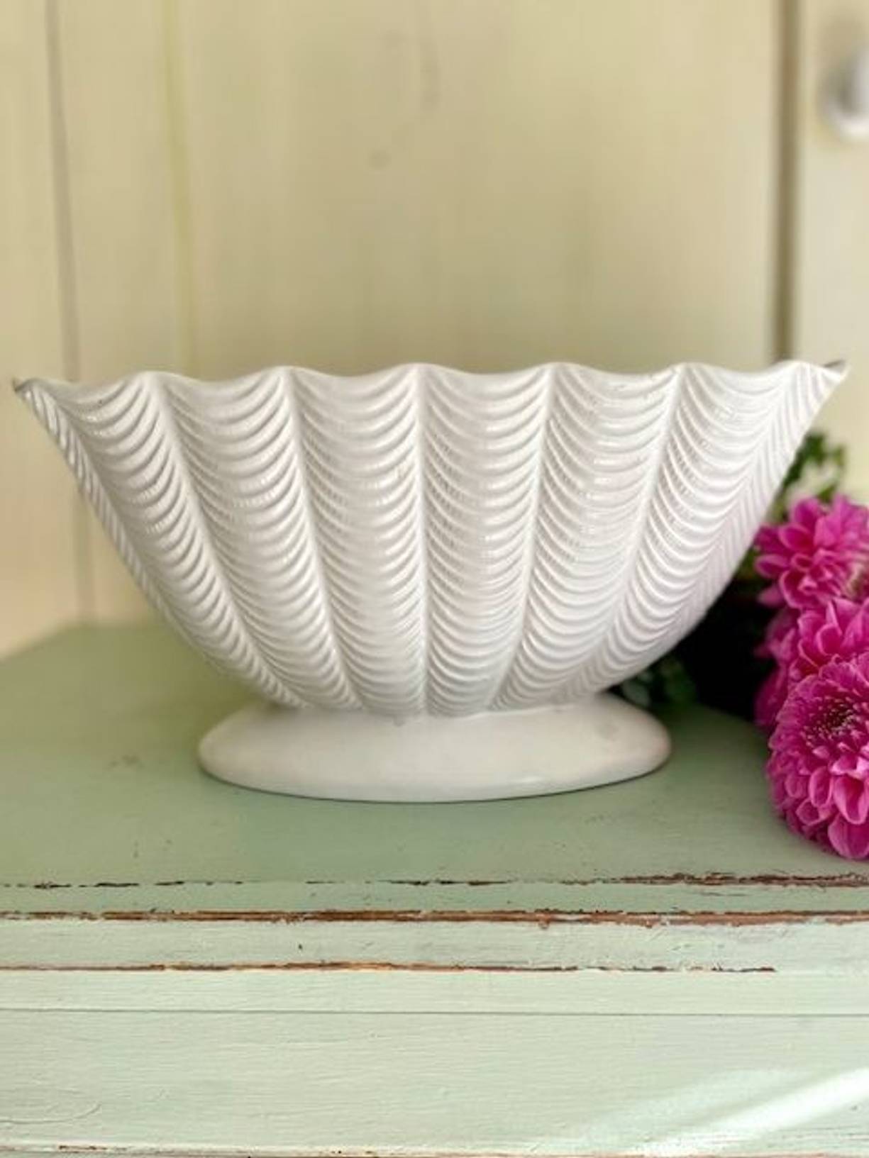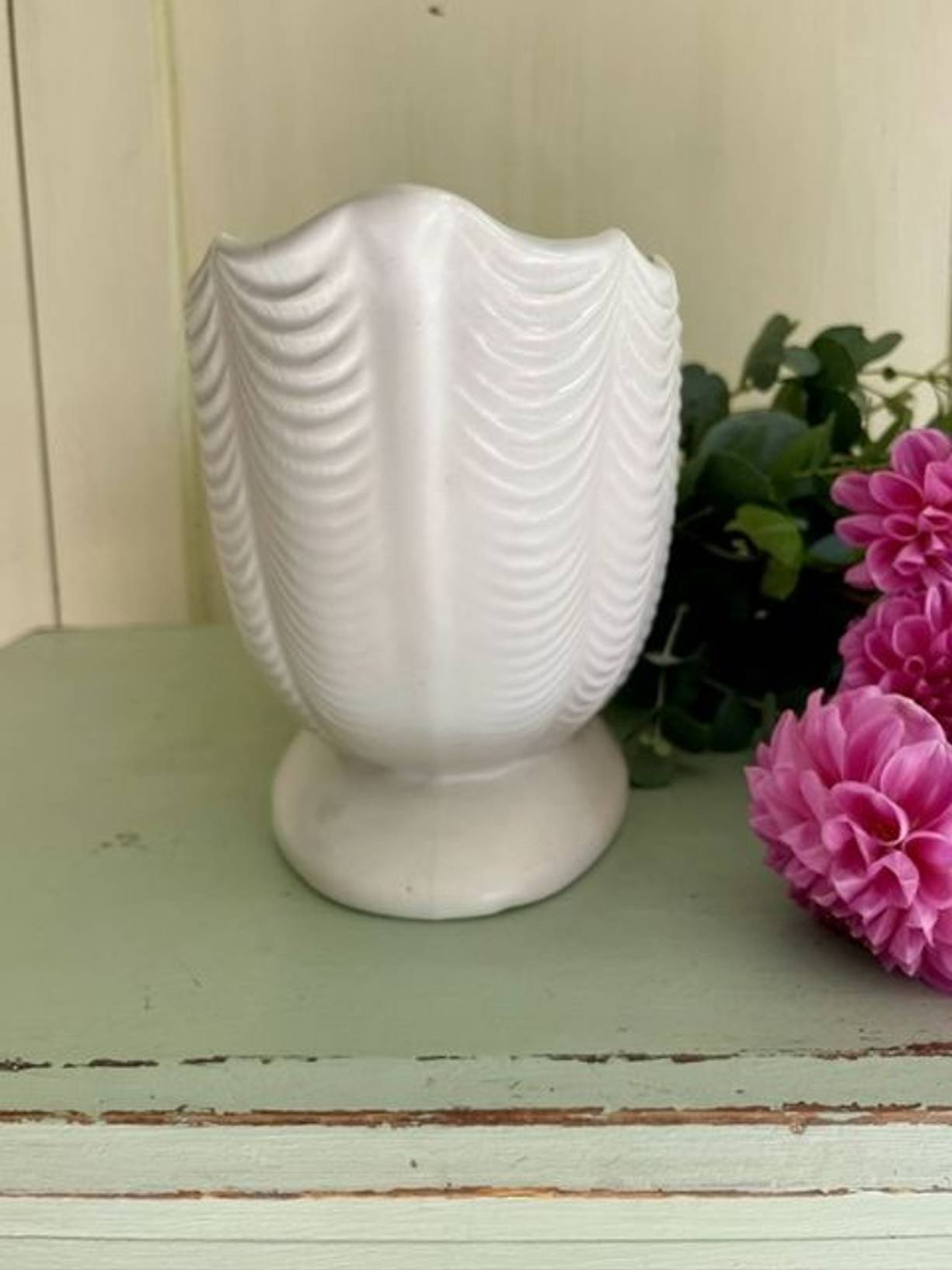 A stylish vintage mantle vase with a scalloped shell design made in the 1950s by Dartmouth Pottery in Devon. A larger size 13” x 5” wide and standing 6” tall, marked on the base Dartmouth, Devon, England, it has its original wire stem holder to make floral or leafy arrangements easier. A mid-century piece in lovely condition for its 70 plus years with no cracks, chips or crazing, the under side rim where it has been standing shows normal signs of wear.