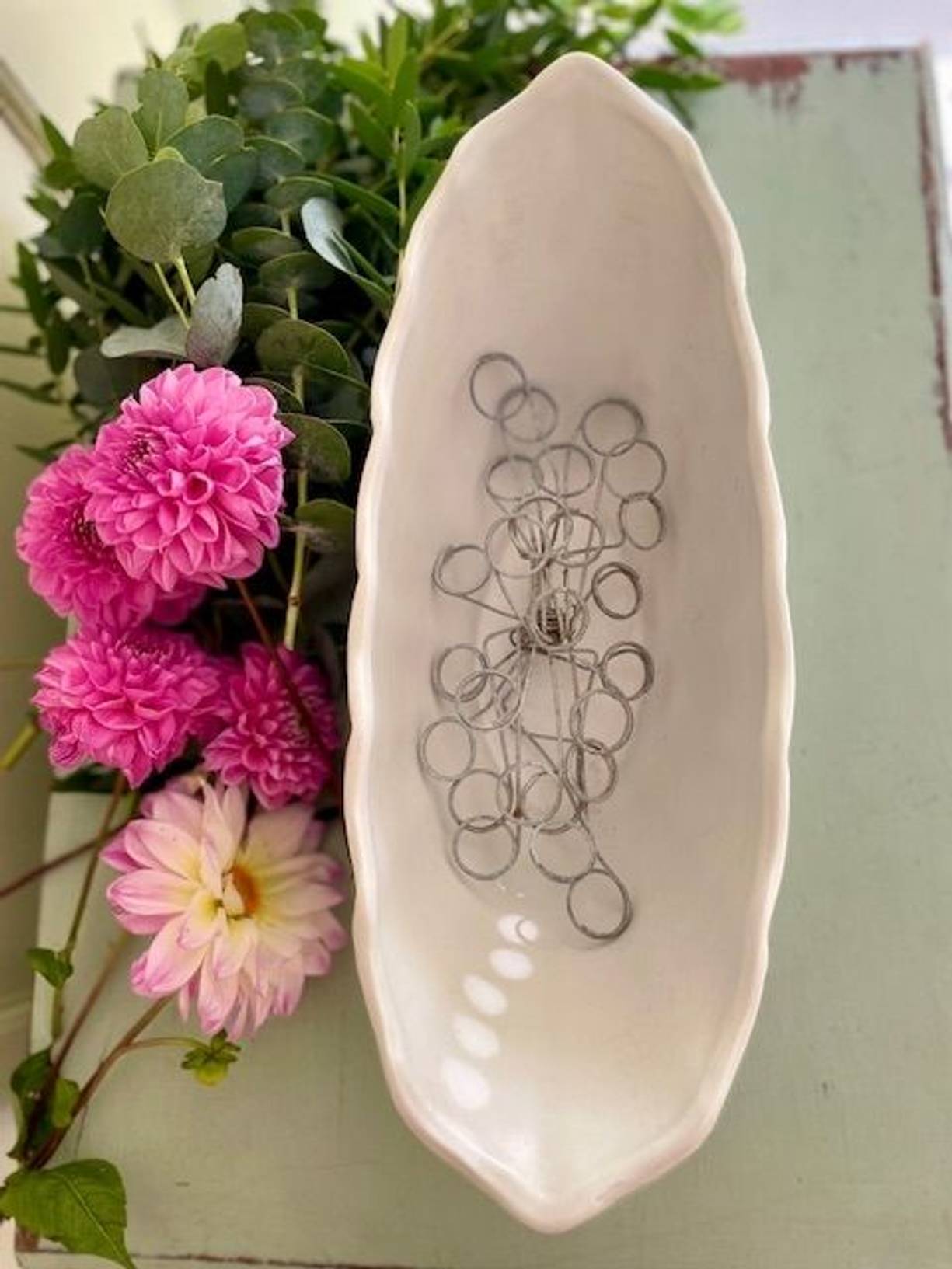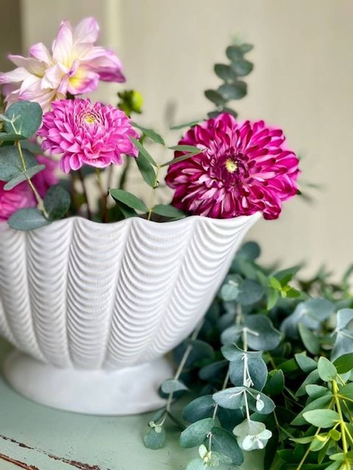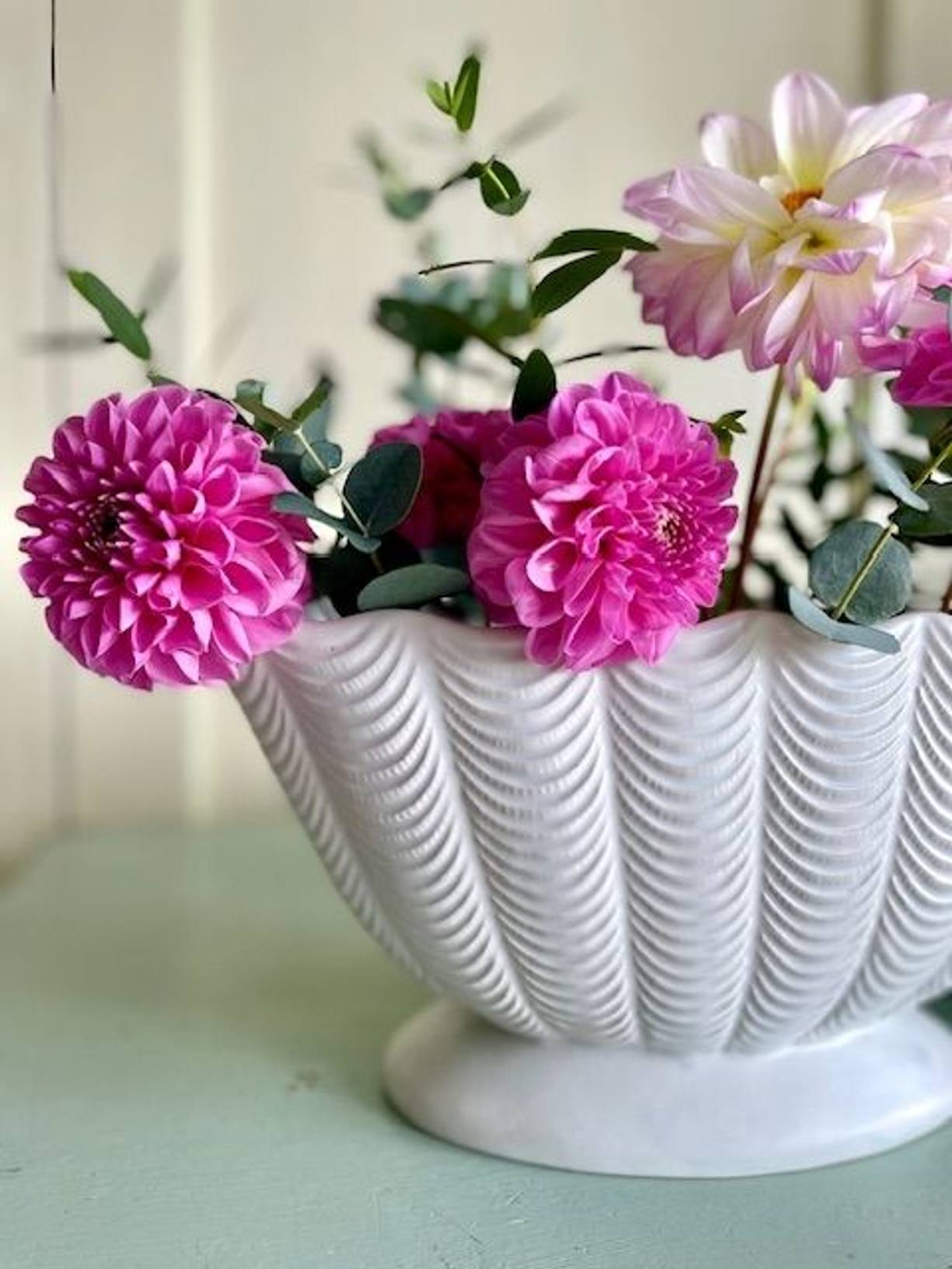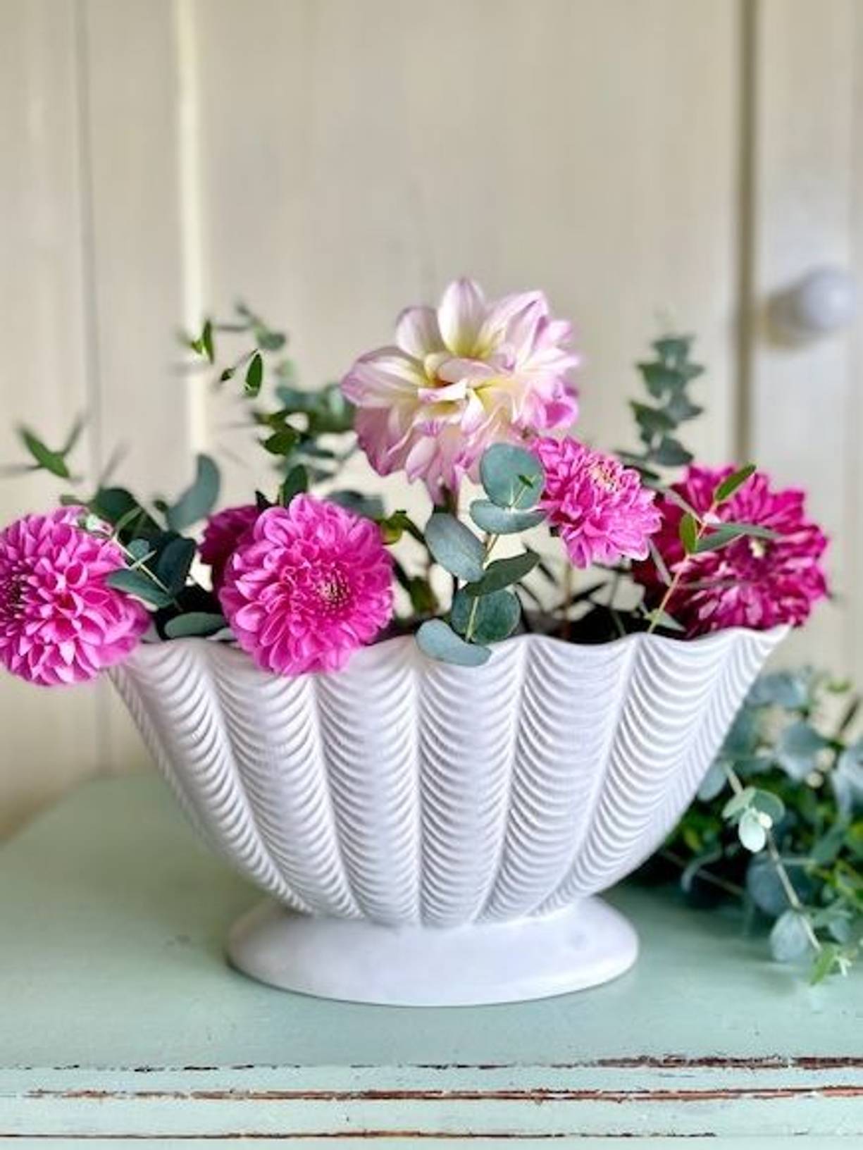 A stylish vintage mantle vase with a scalloped shell design made in the 1950s by Dartmouth Pottery in Devon. A larger size 13” x 5” wide and standing 6” tall, marked on the base Dartmouth, Devon, England, it has its original wire stem holder to make floral or leafy arrangements easier. A mid-century piece in lovely condition for its 70 plus years with no cracks, chips or crazing, the under side rim where it has been standing shows normal signs of wear.