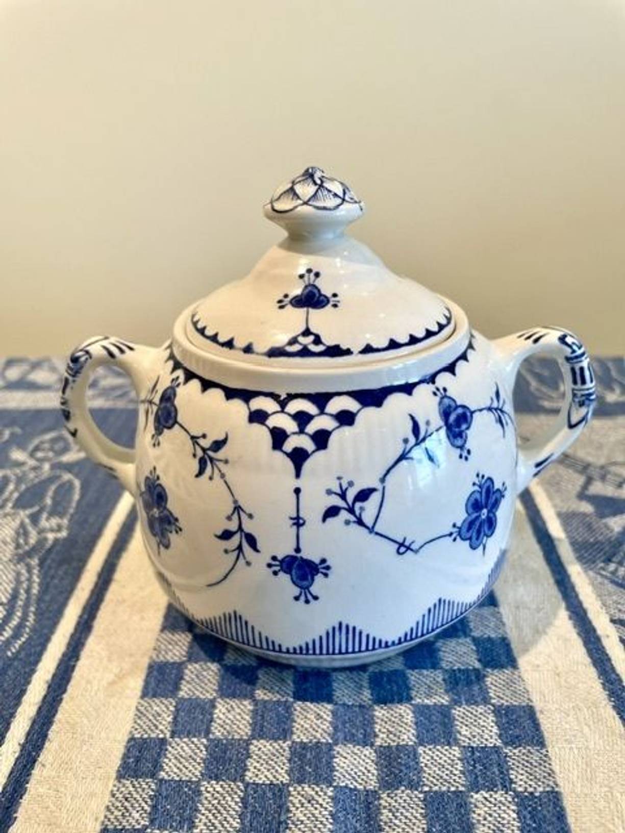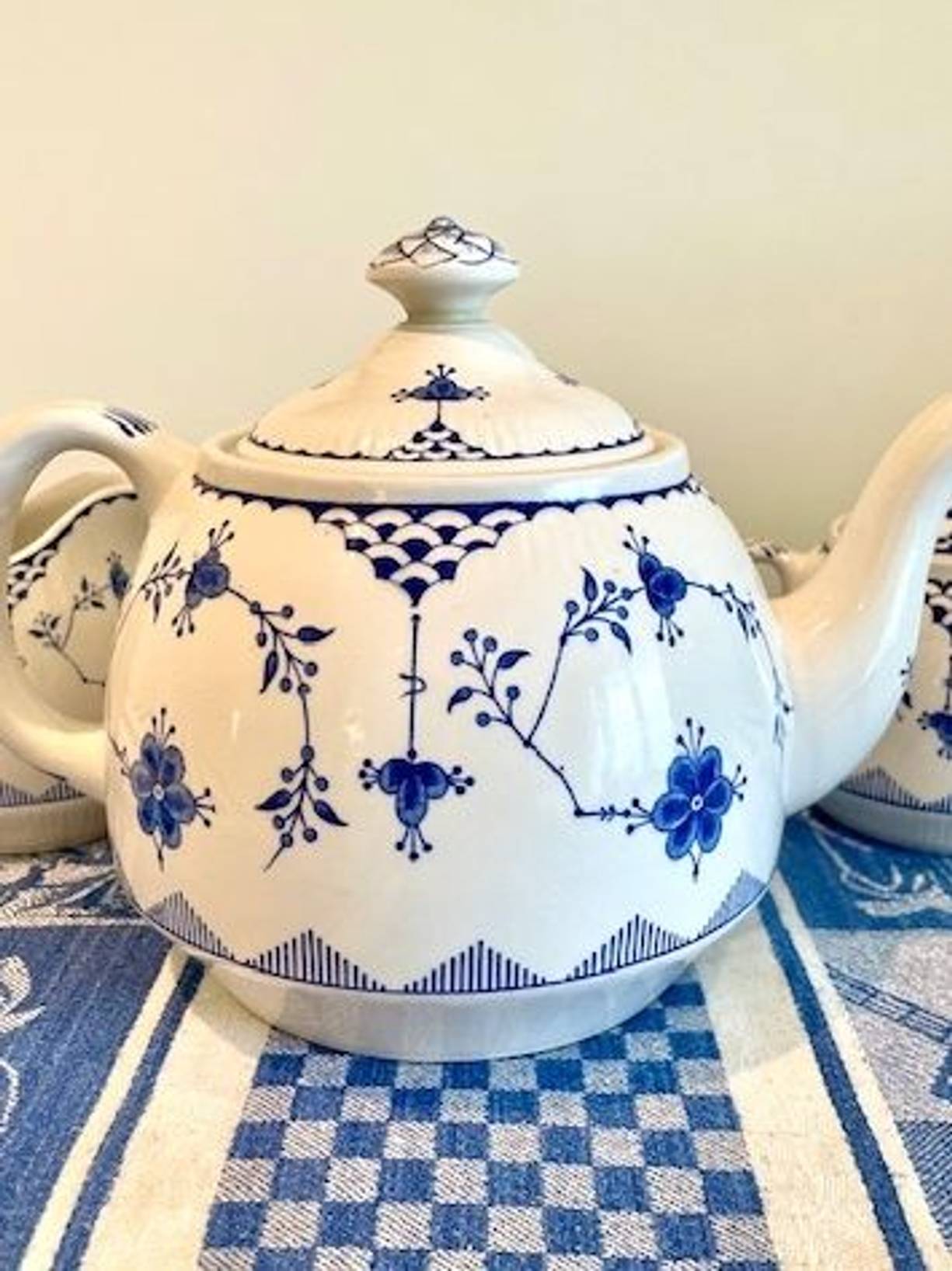 Vintage Mason’s ironstone in the ever popular blue & white Denmark pattern. A 2 pint teapot, lidded sugar bowl and milk jug. Excellent quality table ware in lovely condition with no damage, just some crazing to the inside of the pot and a tiny nick under the rim of the neck of the pot. All 3 pieces have the Mason’s stamp.