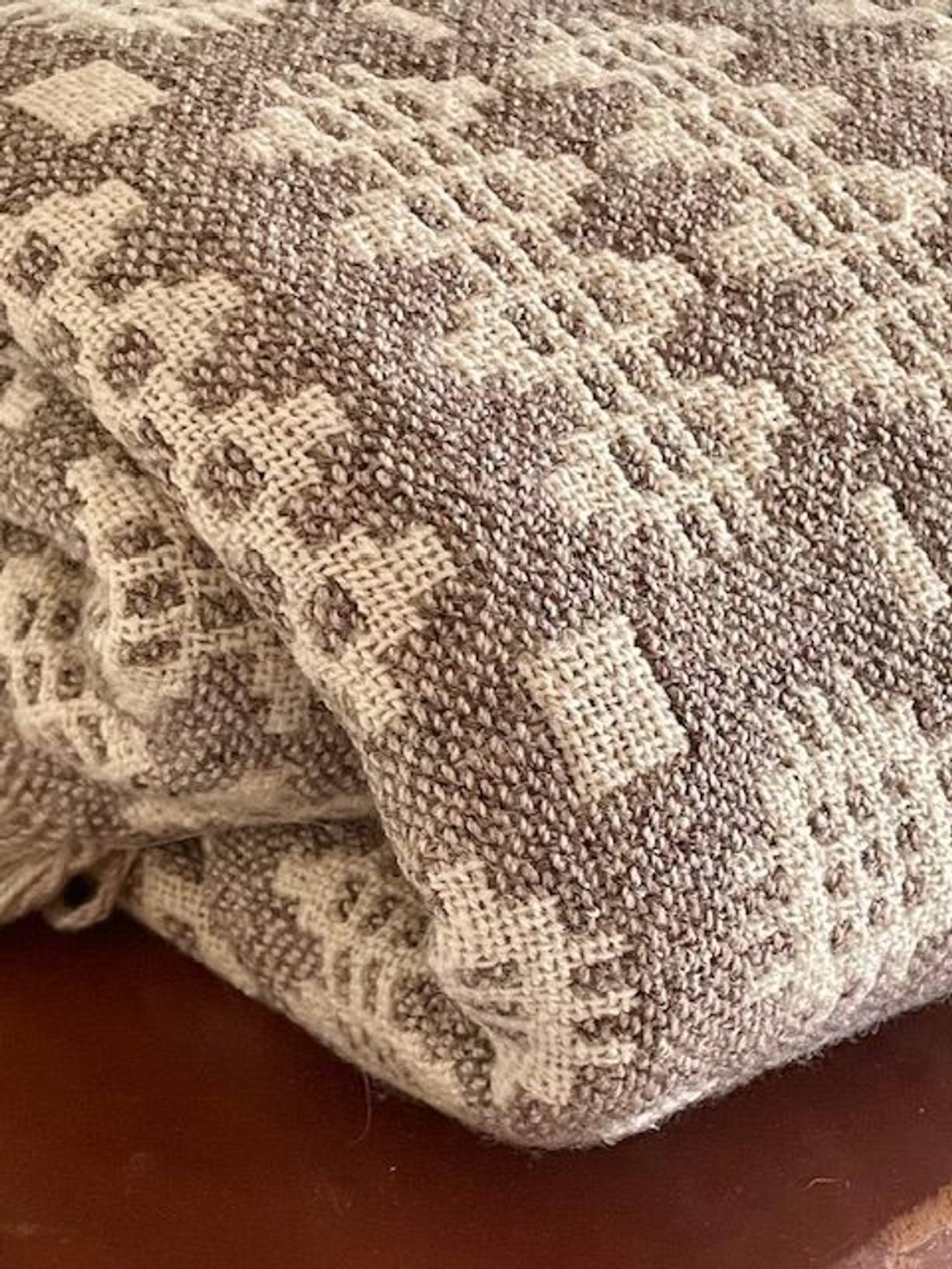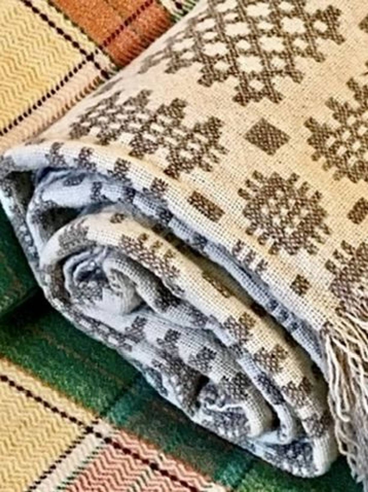 A traditional pure new wool Welsh tapestry blanket in subtle neutrals of pebble and cream, a double cloth textile woven at Rock Mills, Capel Dewi. The tapestry consists of two layers of wool woven together giving a reverse colourway on the other side, finished with fringing at both ends. It measures 84” x 86” and is in excellent clean condition with its original label & no damage. It is a fairly heavy blanket weighing just over 3kg and it has been gently laundered. Rock Mills are renowned for the quality and durability of their textiles and the mill is still working producing traditional woven blankets.