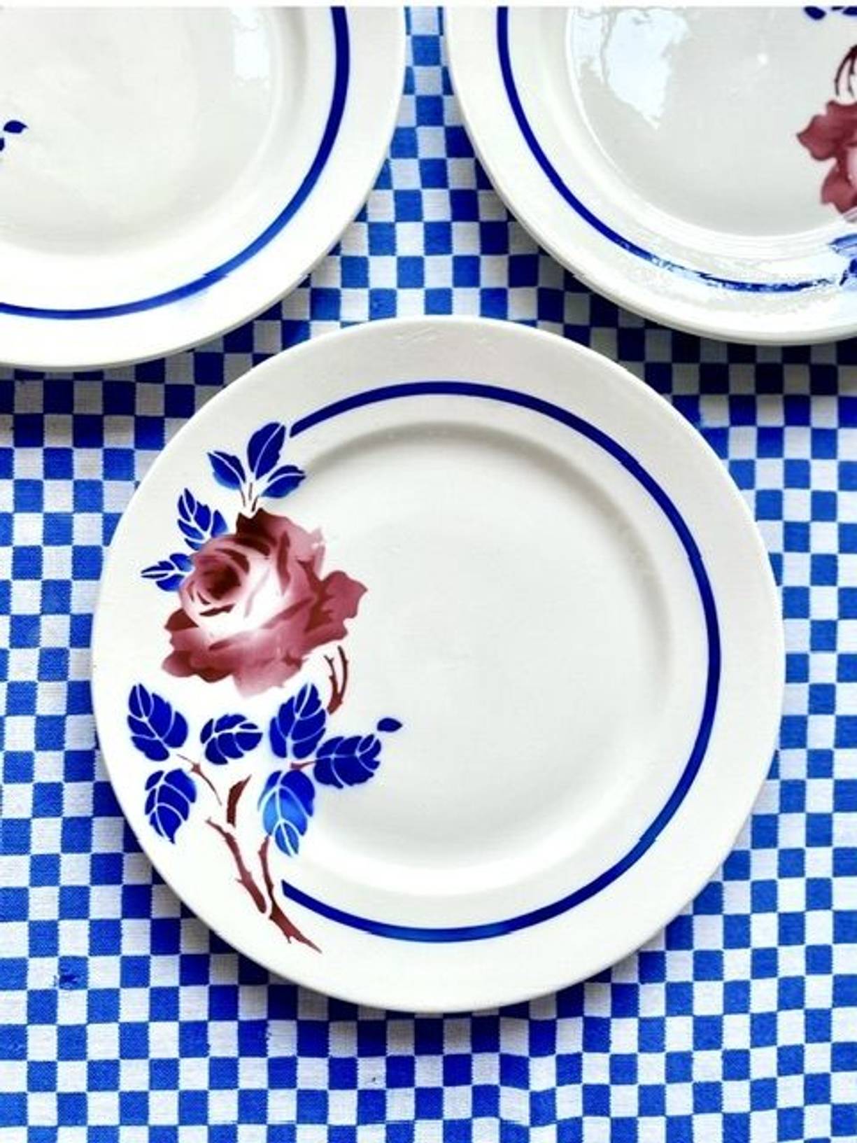 A set of four classic French 8” supper plates with pink & blue stencilled roses & blue banding, the pattern 'Chantal' made by K & G Luneville in the 1930s/40s. Classic French tableware in excellent condition with no cracks, chips or crazing, now rare to find.