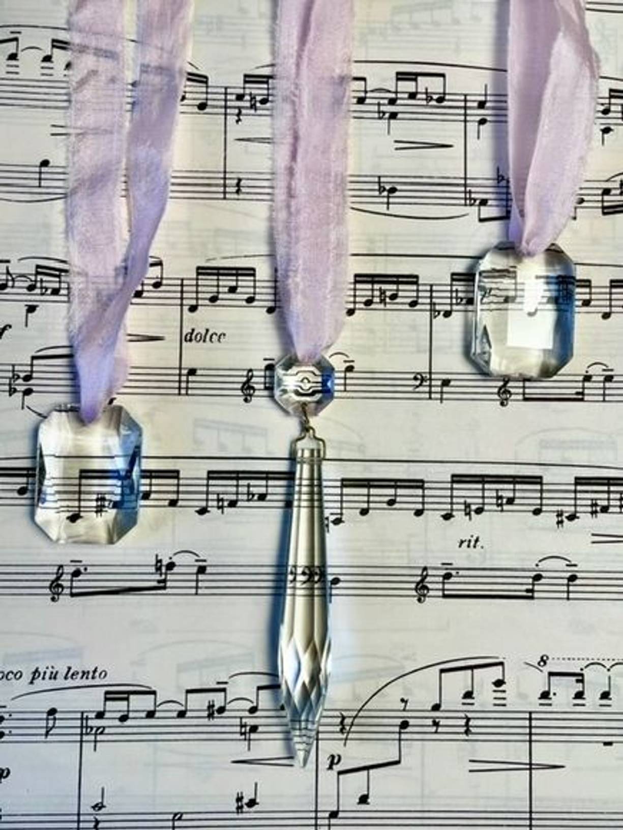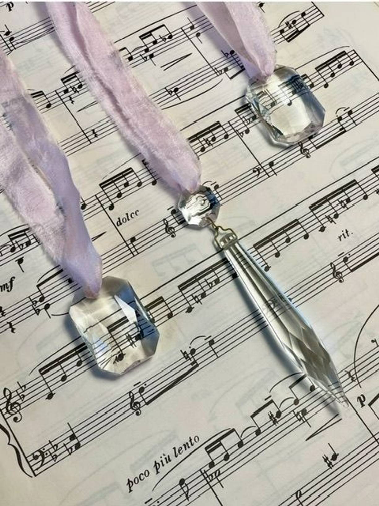 Lovely vintage chandelier glass for added sparkle in Midwinter, one long & two rectangular drops with pink torn silk ribbon to hang, the longest drop is 10cms.
