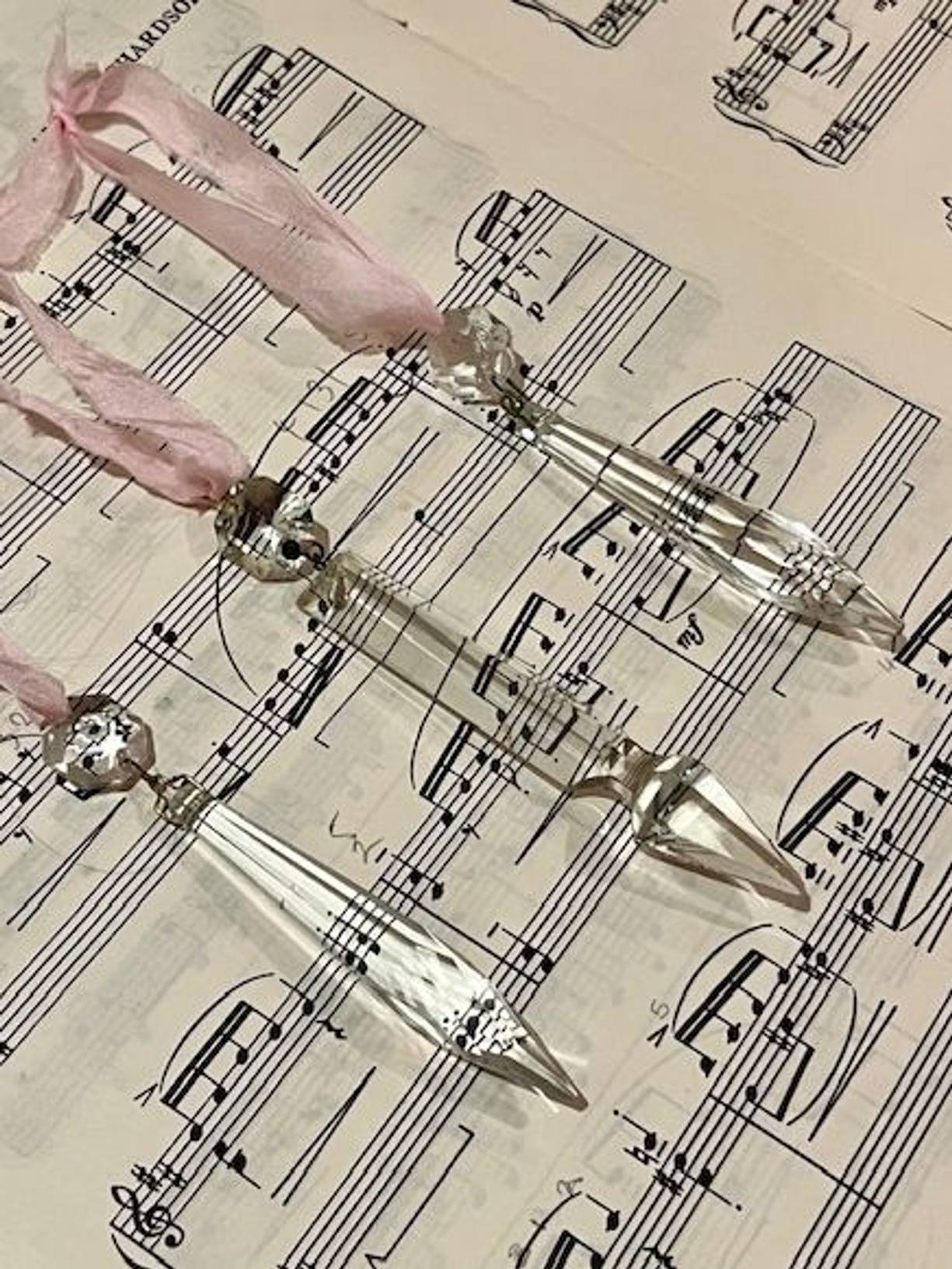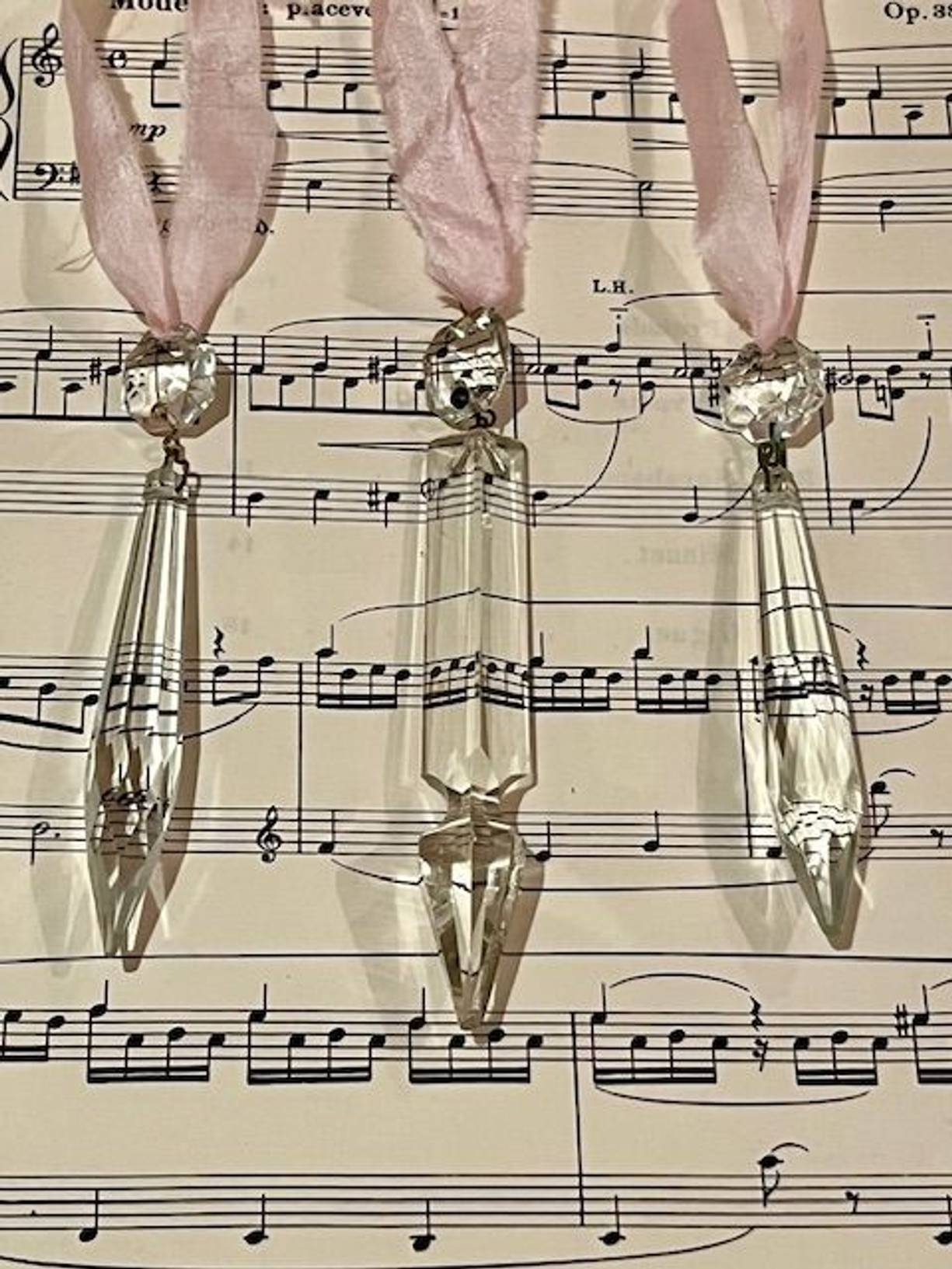 Three vintage glass chandelier drops for Winter sparkle, two faceted and one triangular, with pink torn silk ribbon to hang, the longest is 4.5”/12cm.