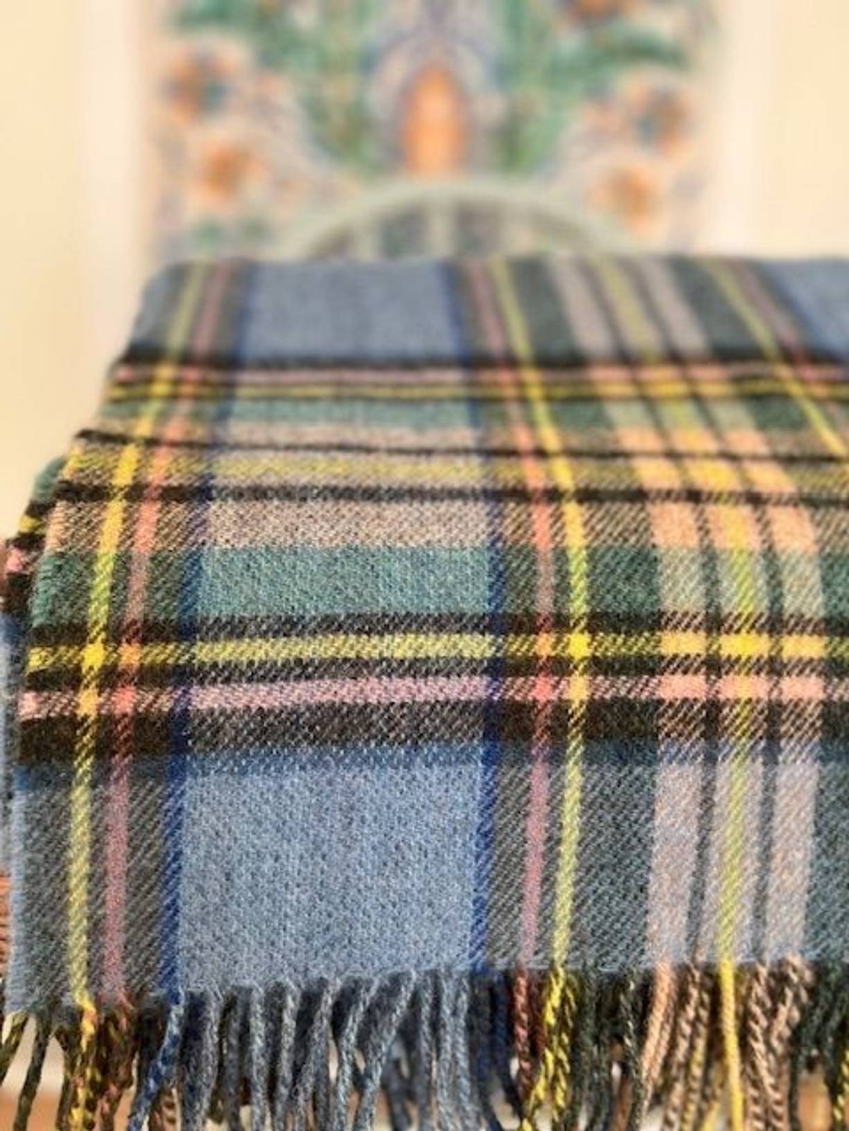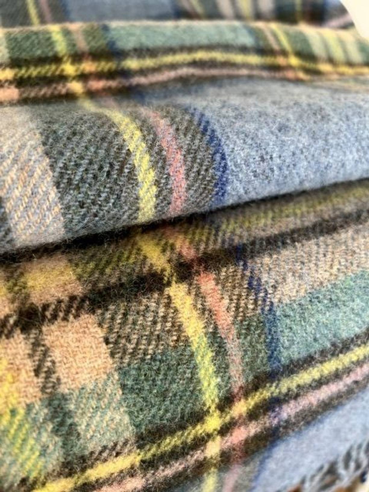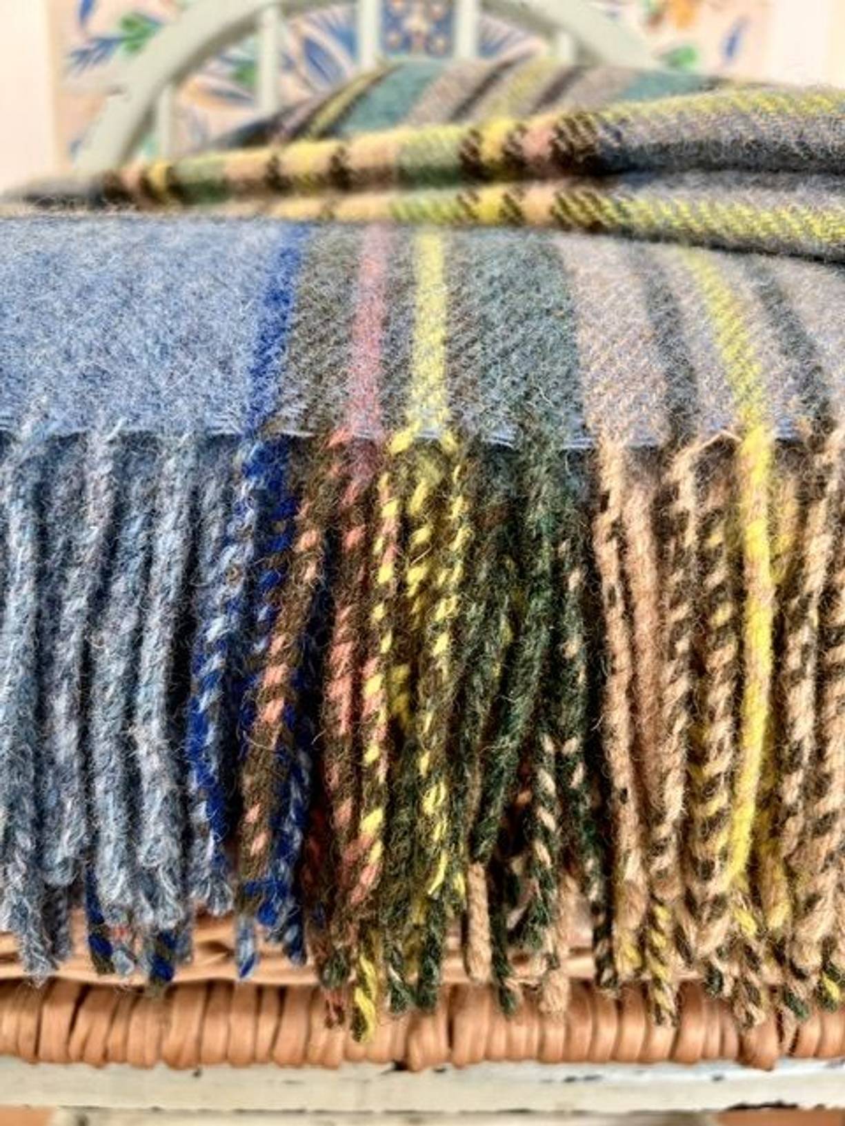 A gorgeous mix of soft blues, greens, heathers and biscuit, a super quality traditional Scottish blanket 55” x 61” with 2.5” fringes. A soft & cosy pure wool textile in excellent clean condition. The label mentions dry cleaning but the blanket will wash well on a cool wool cycle.
