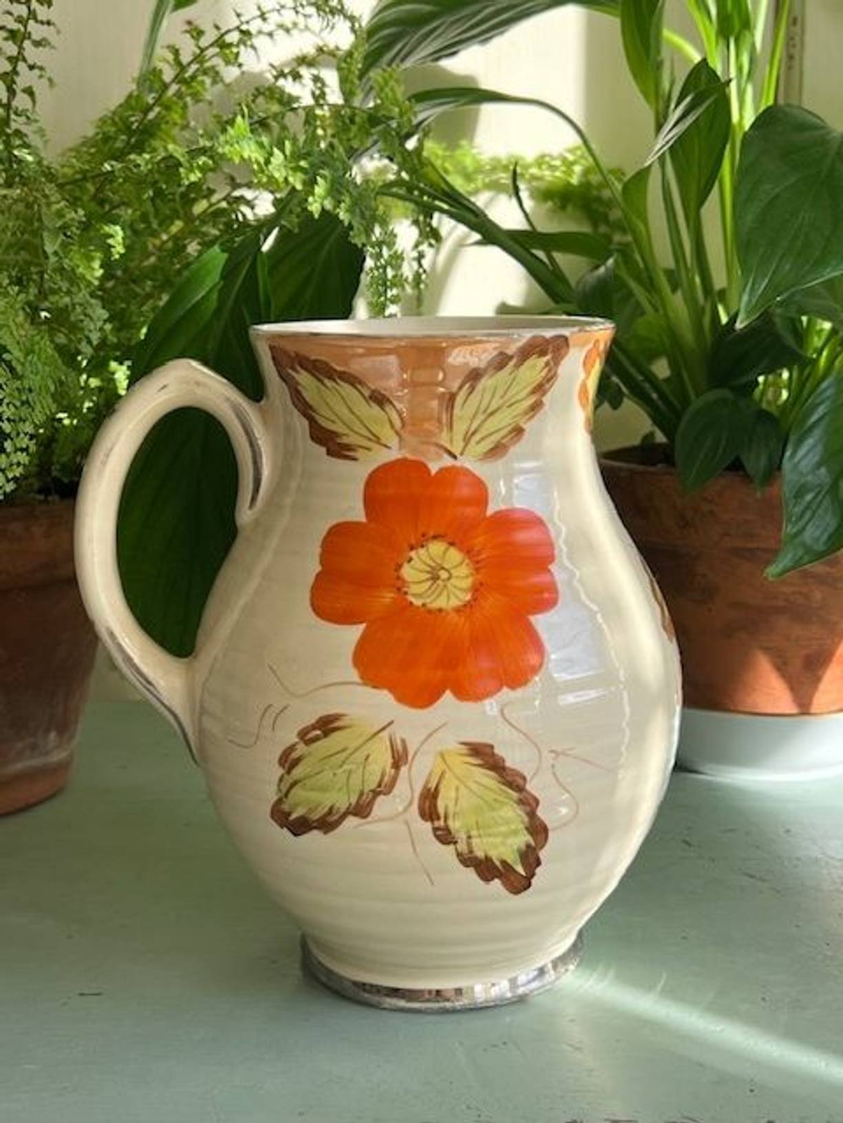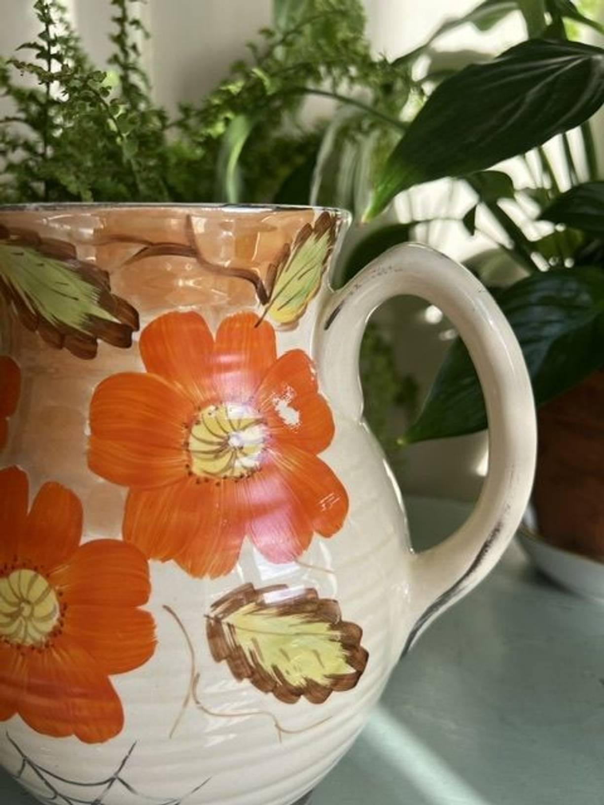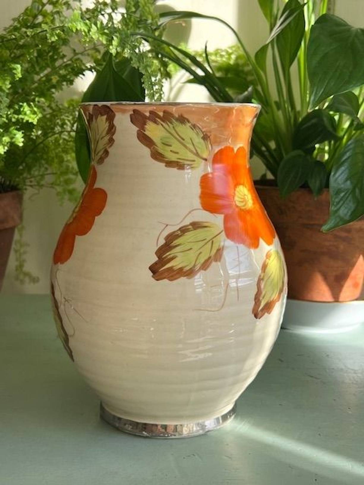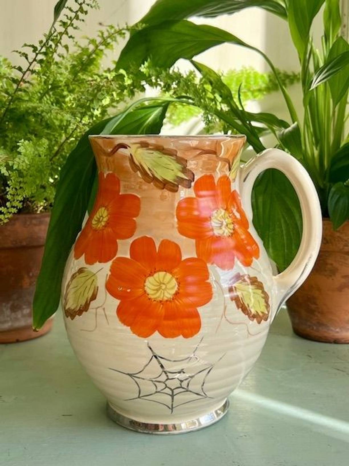 A 1934 Arthur Woods ‘Quality’ ceramic vase in lovely original condition & very reminiscent of its time. 8” tall with a ribbed body and hand painted vibrant orange flowers & leaves, it has a good glaze, understamp and no damage, just a little wear to a flower and the gilding. Love the spiderweb on this vibrant vintage vase - just add the pussy willow!