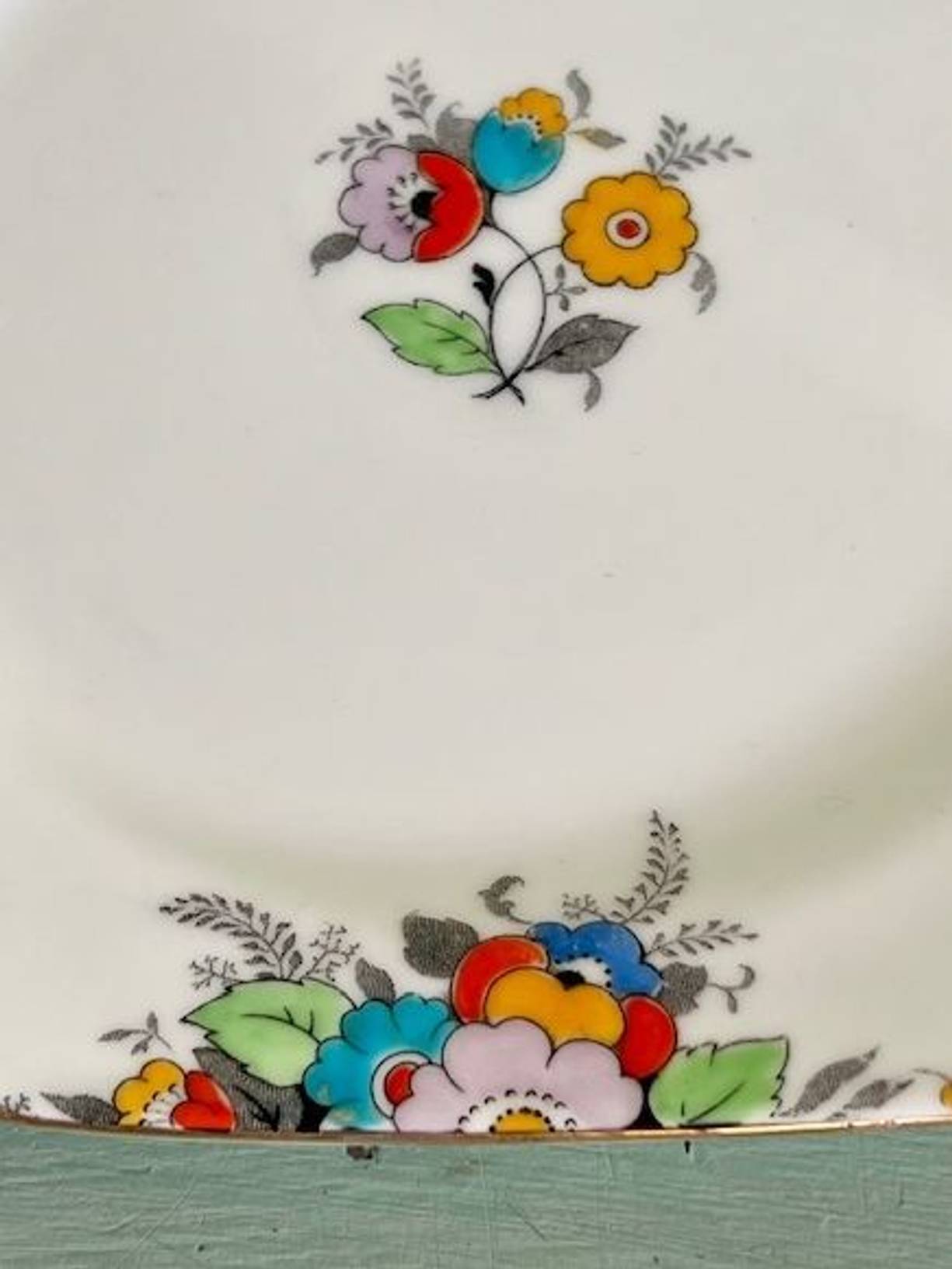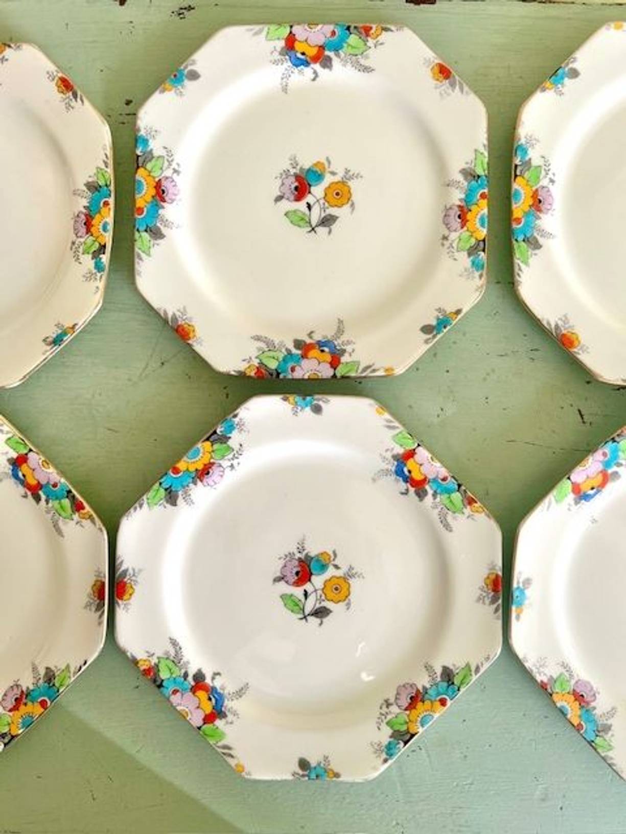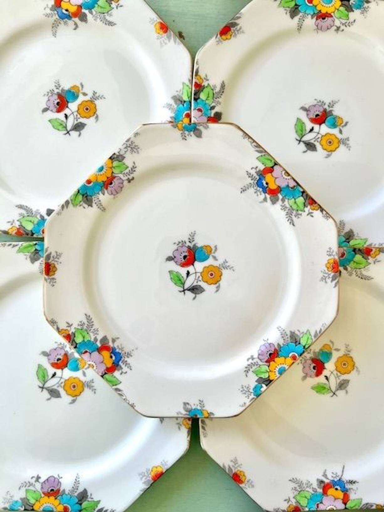 A gorgeous set of 1920s fine bone china tea plates with the hand painted design ‘Bouquet’ made between 1920 and 1932 by Paragon China. Six 16cm octagonal tea plates, vibrant twenties colours, super quality tableware in excellent condition for their considerable age, just some wear to the gilding.