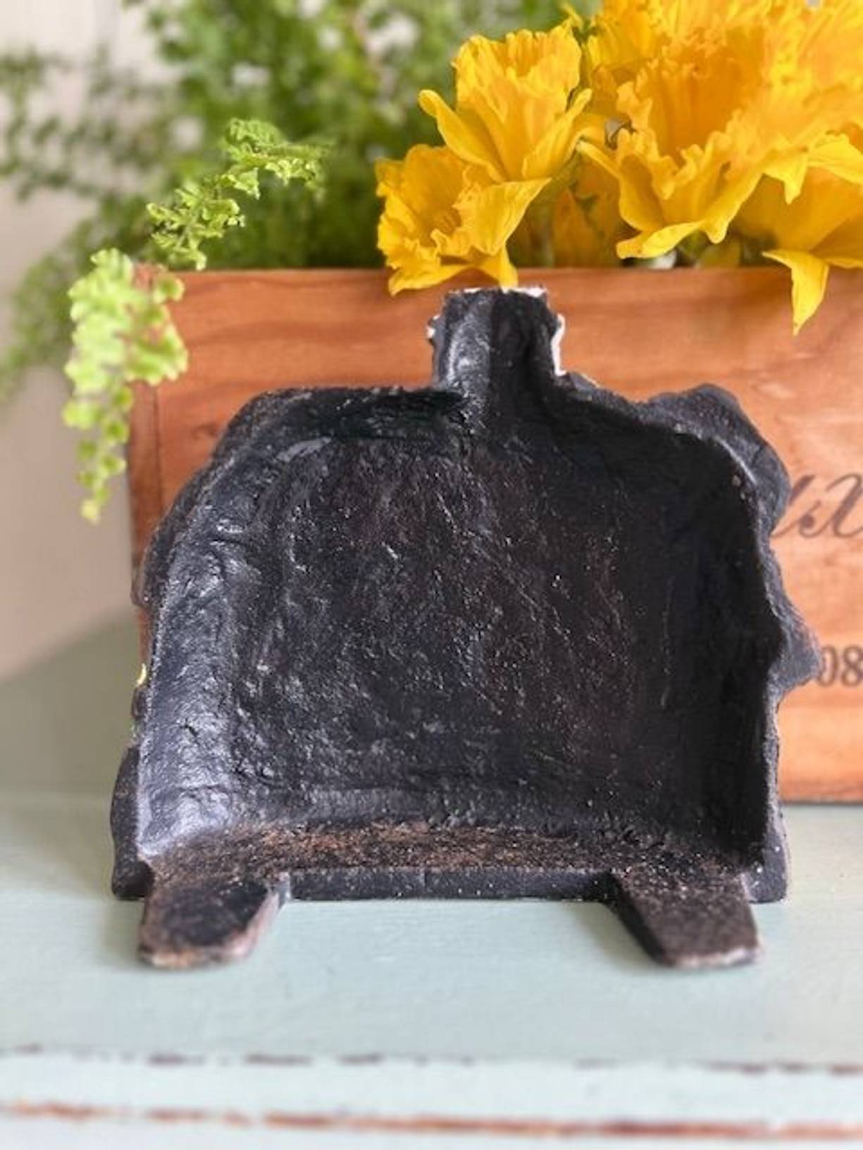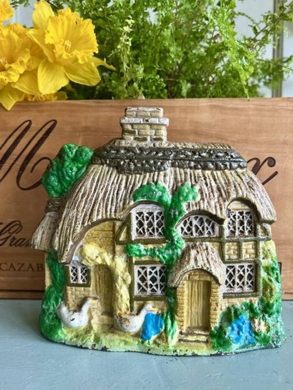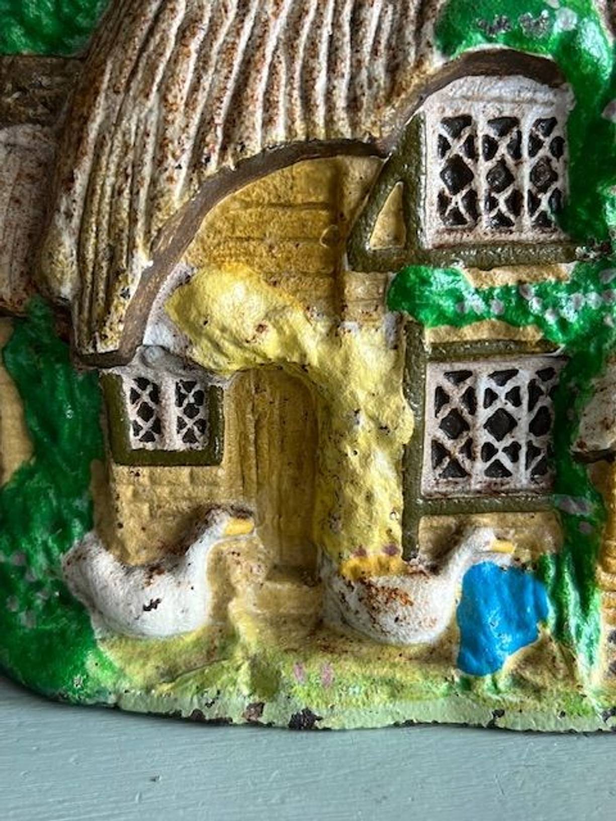 A charming old cast iron door stop, a country cottage with thatched roof, leaded windows & 2 little geese. In good condition for its age, measuring 6” x 6.5” and heavy at just under 2 kilos so it does its job well. A lovely decorative stop very useful for old cottage doors.