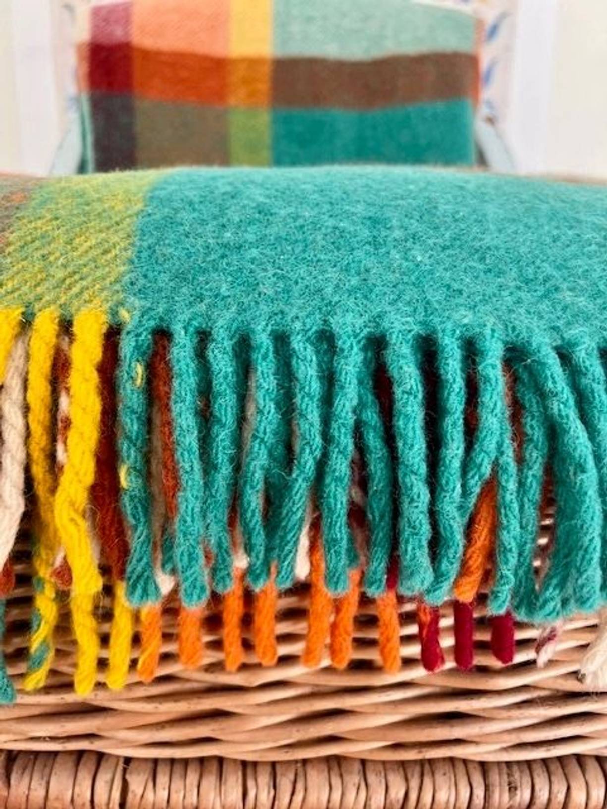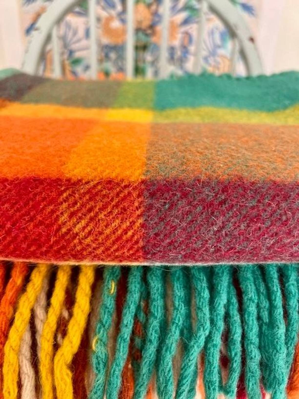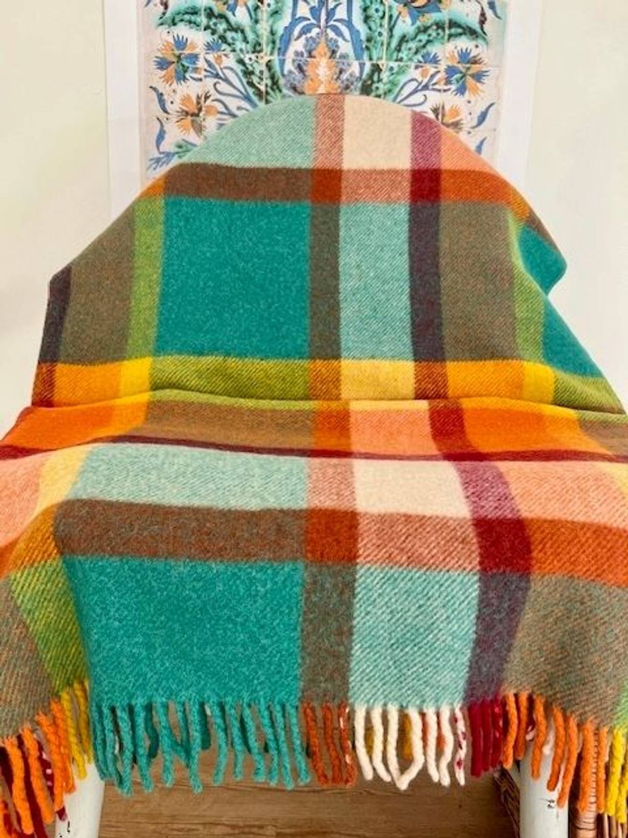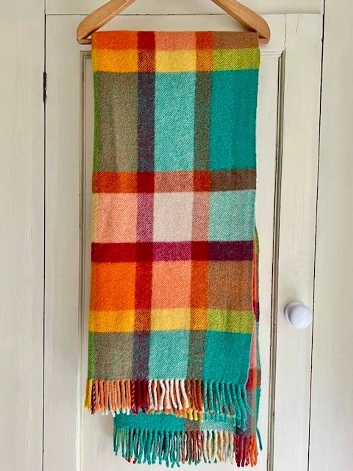 A cheerful, soft & cosy pure wool blanket made in Scotland with its original label. A super quality vintage textile 65” x 54” with fringed ends, it has been gently laundered and is in excellent condition,