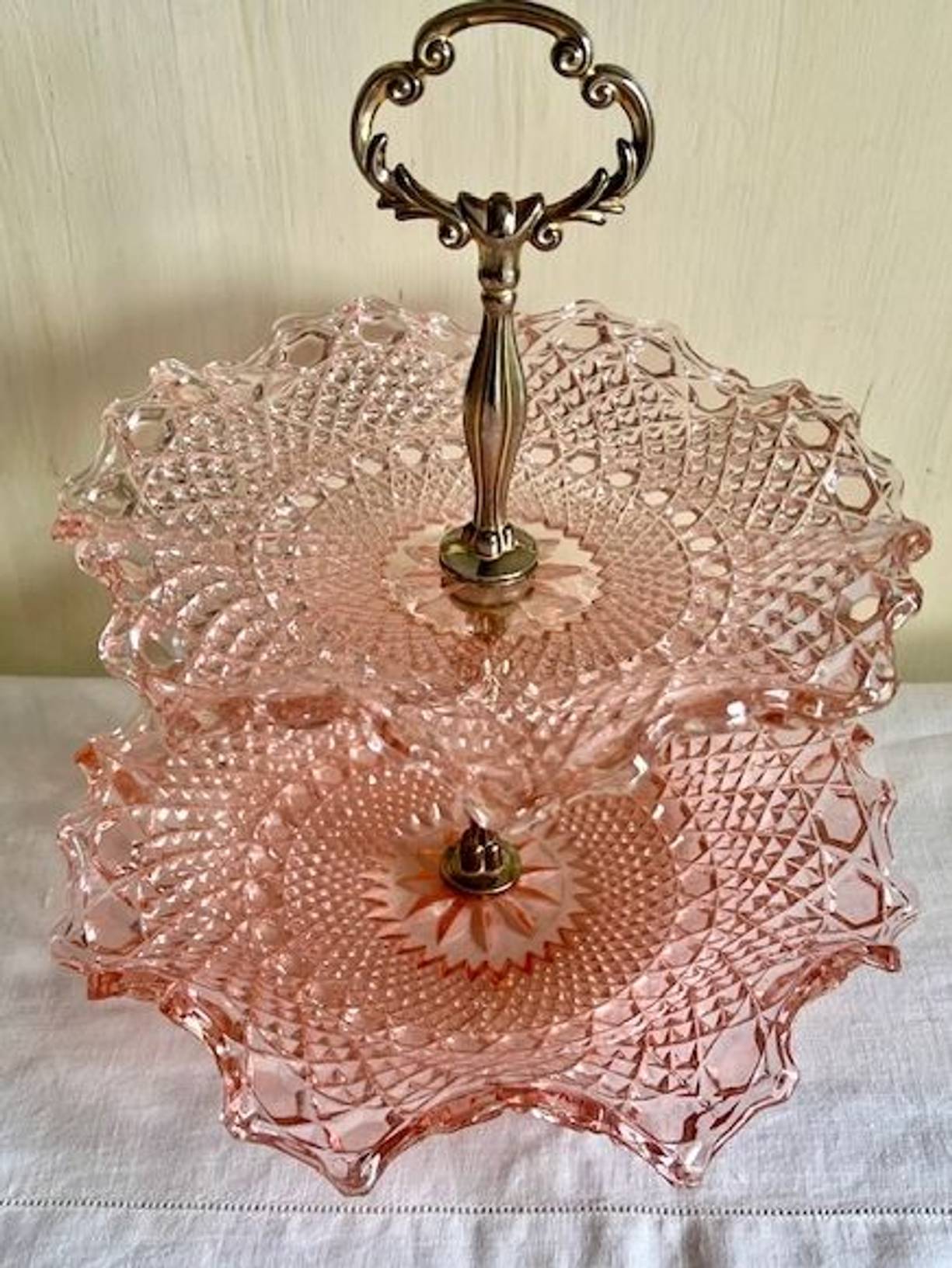 A sparkly vintage glass cake stand with 8” and 9” plates and metallic fixings, pretty pink pressed glass in excellent condition. (The stand will be posted flat and will require assembly, really easy.