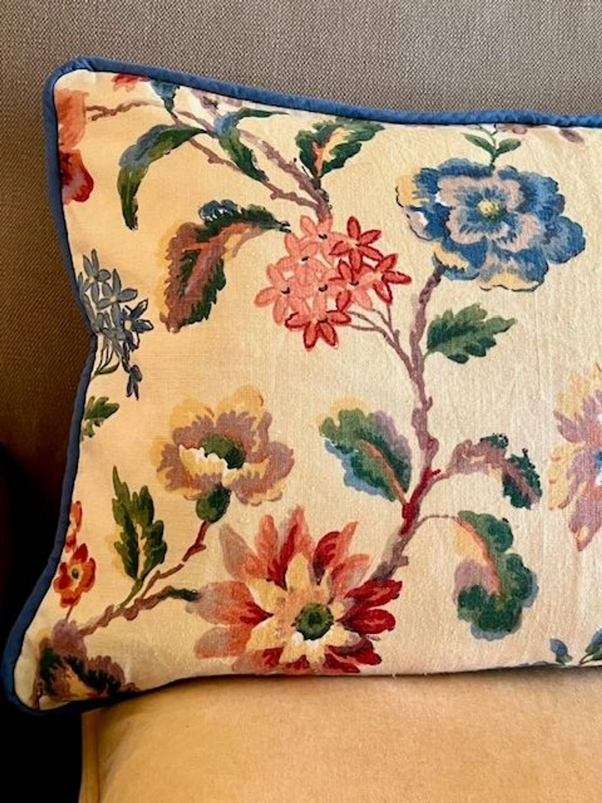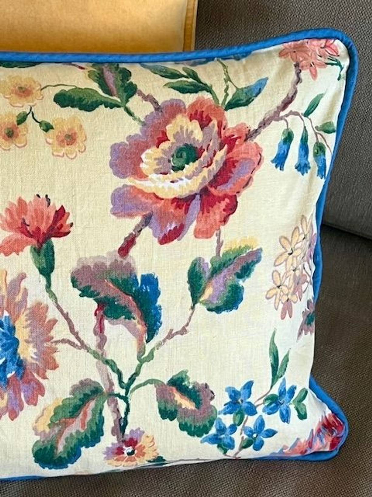 A lovely vintage linen with vibrant flowers in pinks, blues, greens and gold on soft butter yellow, with piped edges and plain cotton backing, a hand made cushion 21” x 13.5” in excellent condition with a new feather pad, the fabric is sewn all around - a cheerful Spring update.