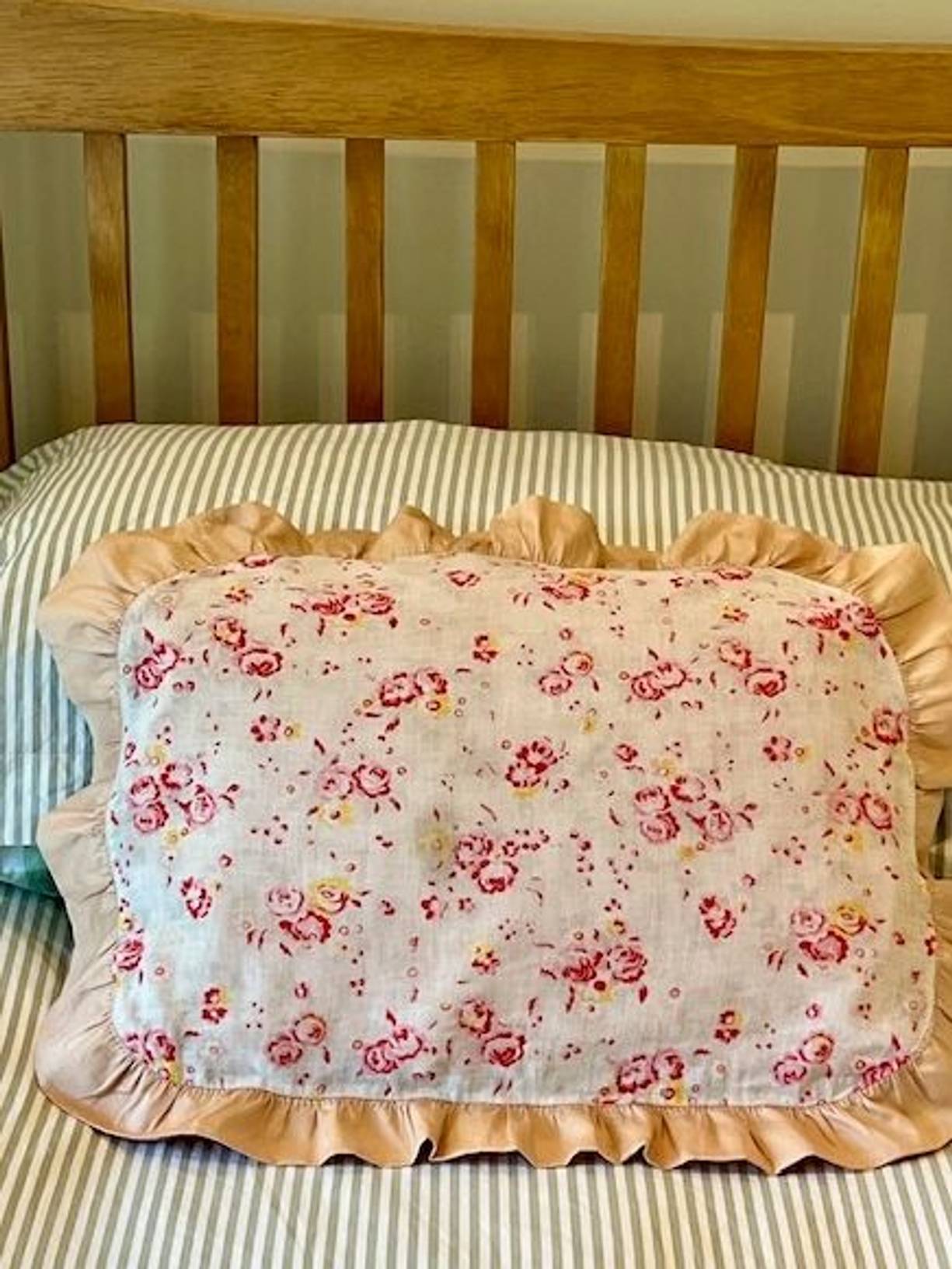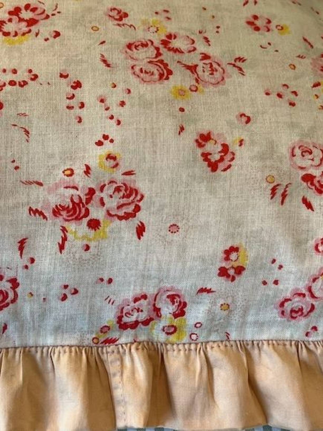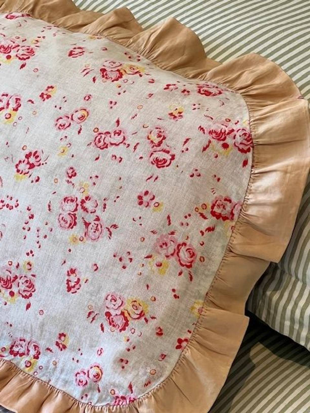 A pretty vintage hand sewn cotton pillow cover from France with a lovely gently faded fine rosy cotton finished with a soft apricot frill. Measuring 21” x 17” (including 2” frill) the reverse is the same cotton as the frill with poppers to close. It has been gently laundered and is in lovely condition for its considerable age, and there is a historic repair to the frill (please see photo) and a very pale mark to the front. A very pretty and nostalgic hand crafted cover.