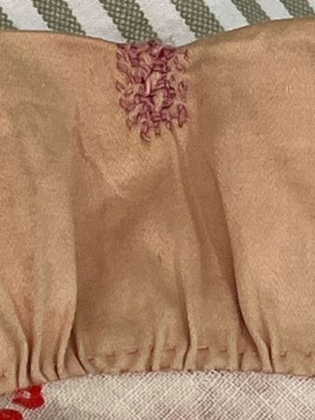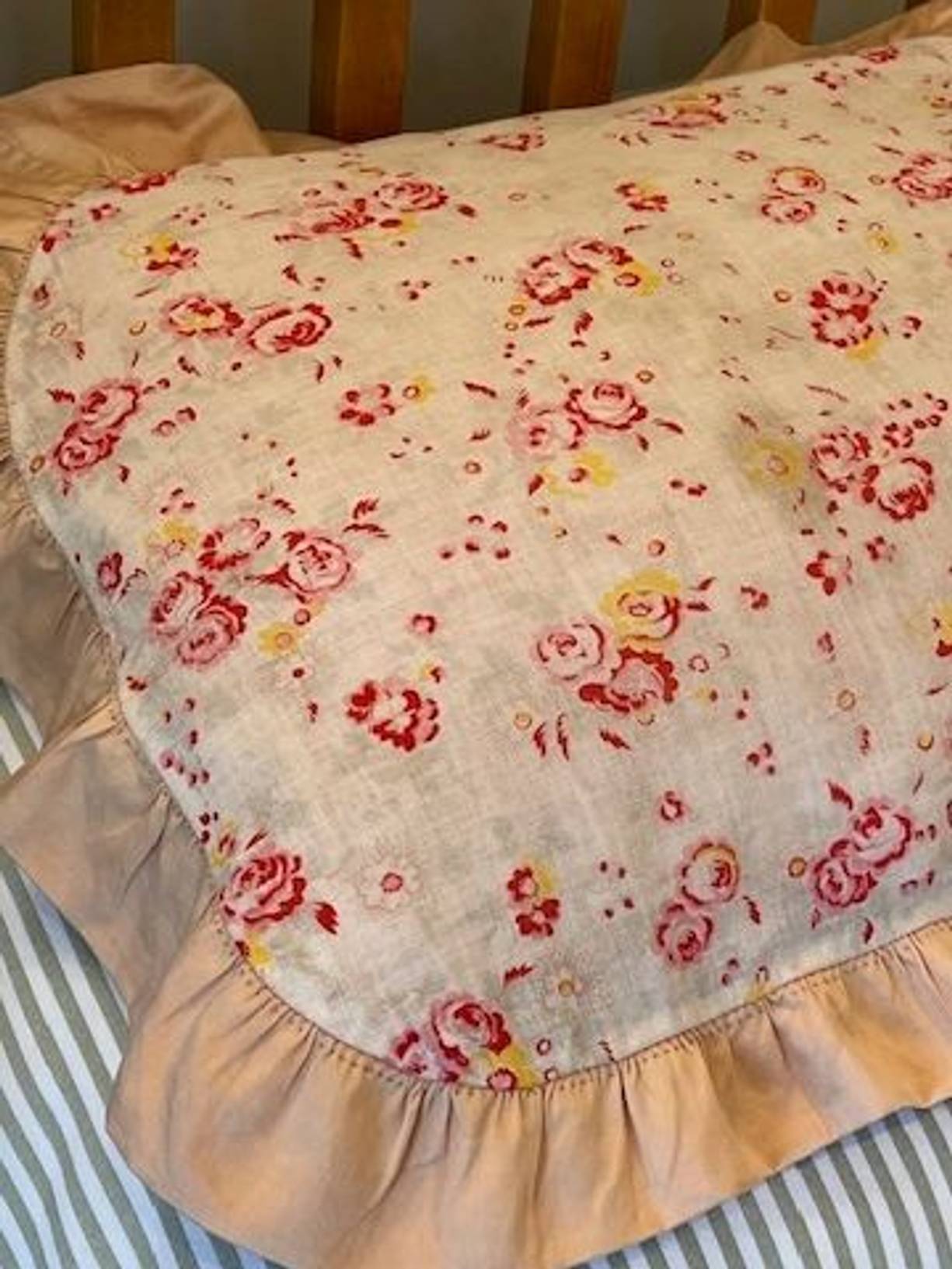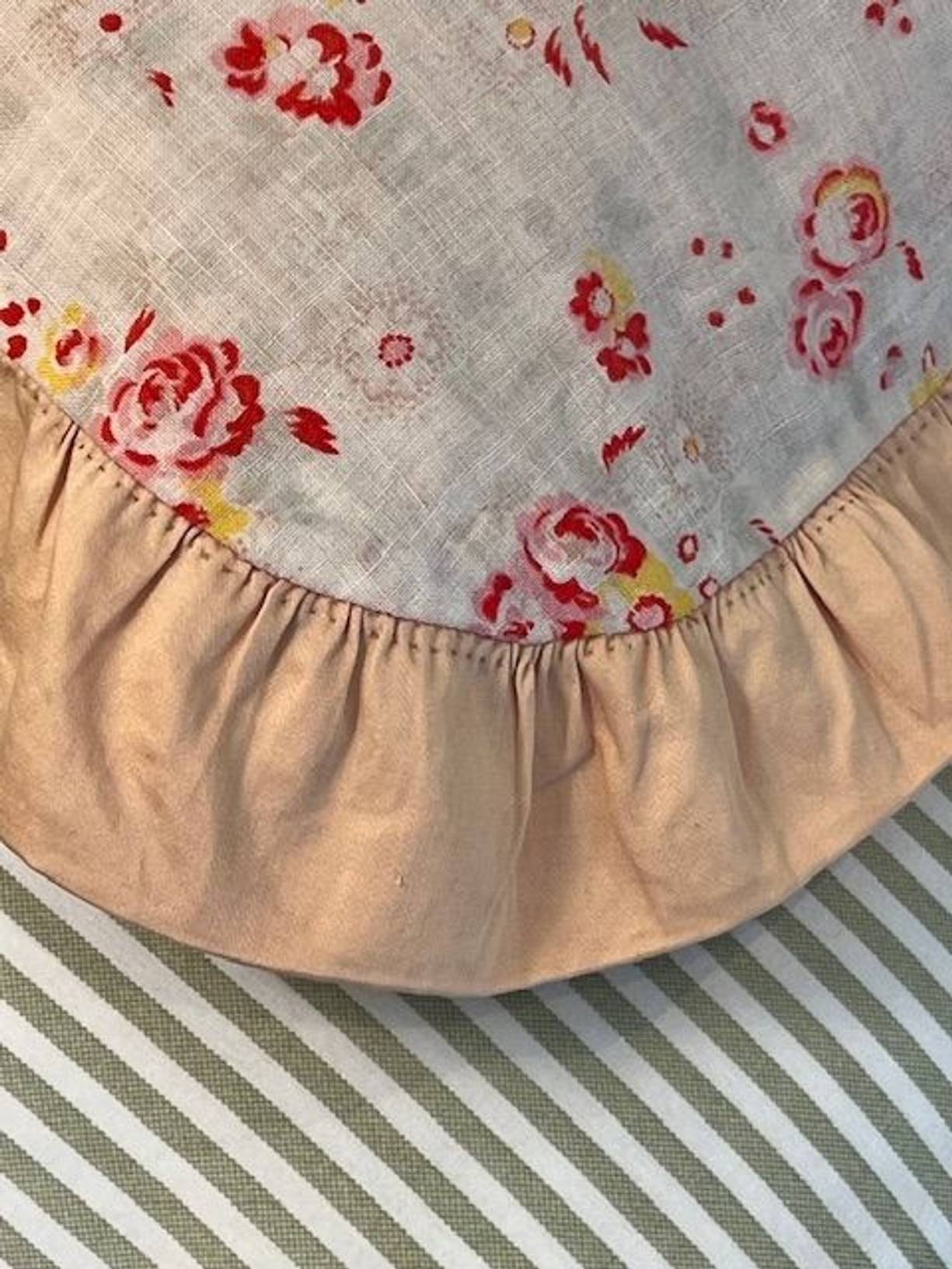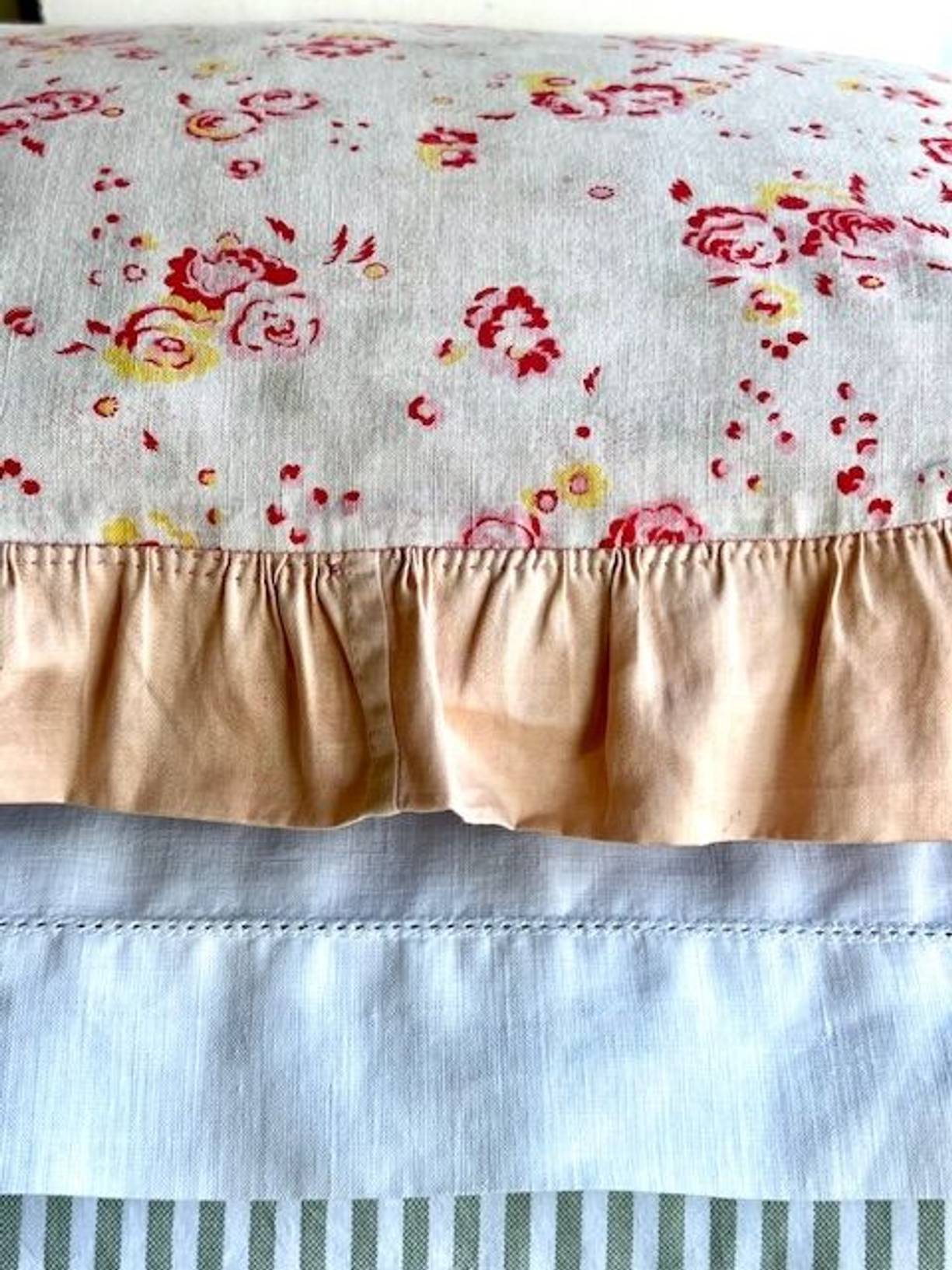 A pretty vintage hand sewn cotton pillow cover from France with a lovely gently faded fine rosy cotton finished with a soft apricot frill. Measuring 21” x 17” (including 2” frill) the reverse is the same cotton as the frill with poppers to close. It has been gently laundered and is in lovely condition for its considerable age, and there is a historic repair to the frill (please see photo) and a very pale mark to the front. A very pretty and nostalgic hand crafted cover.