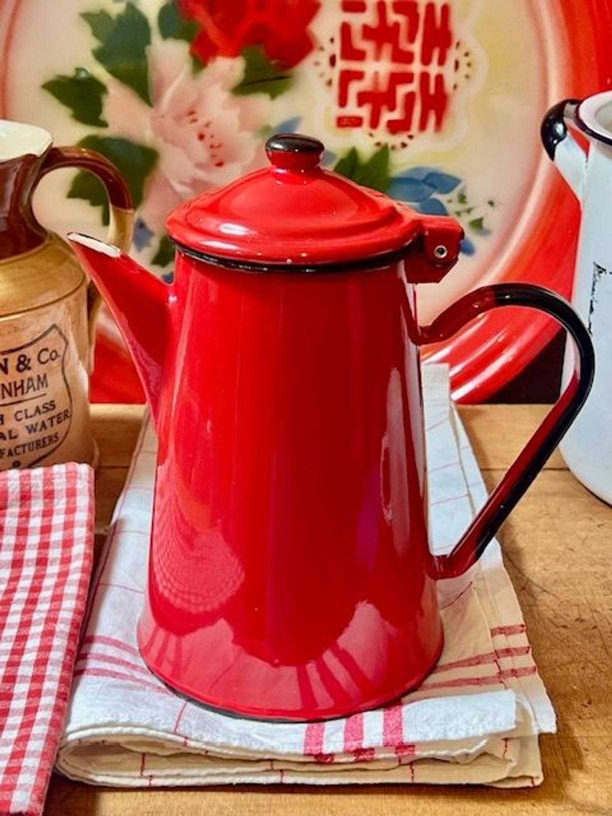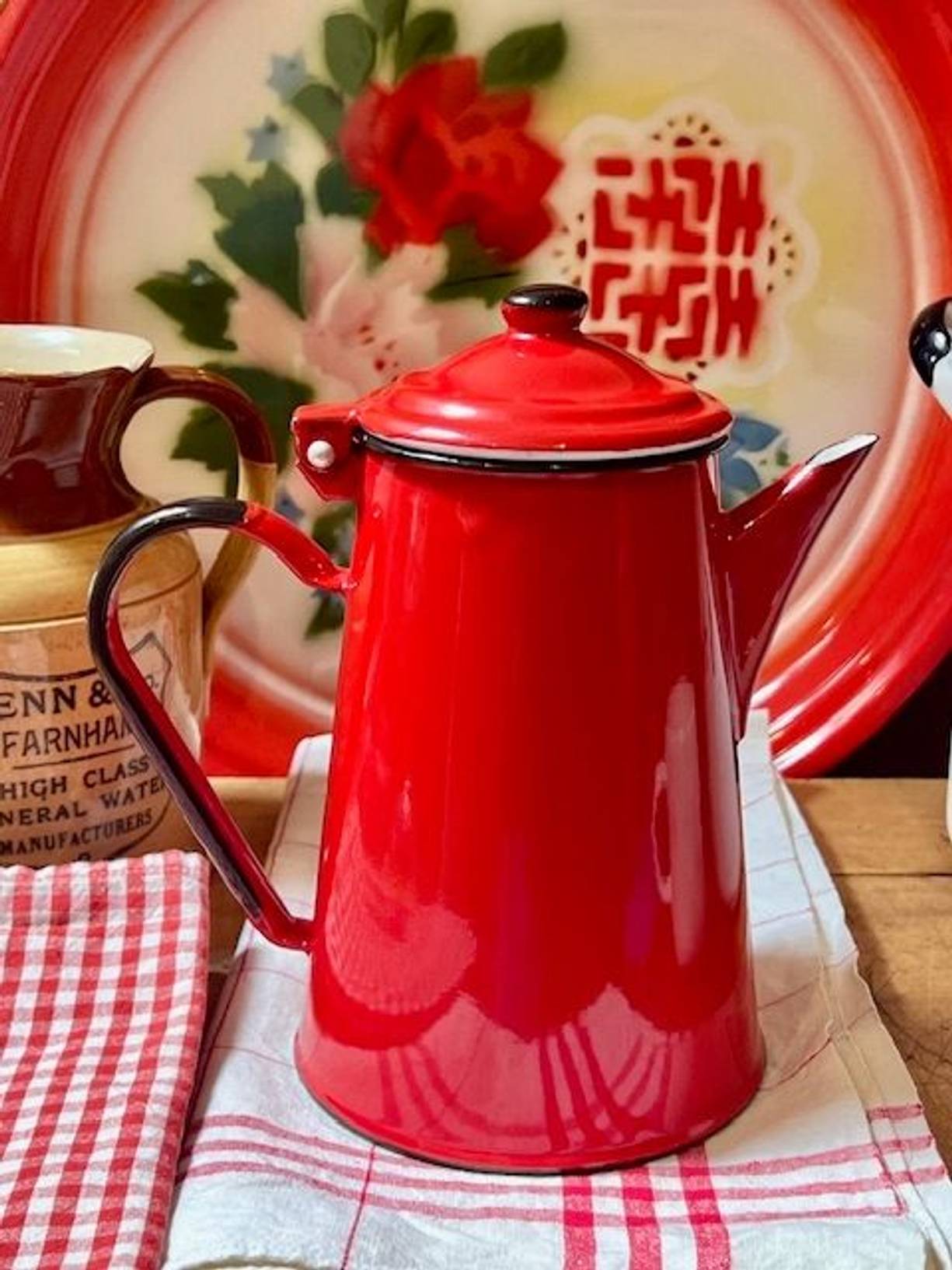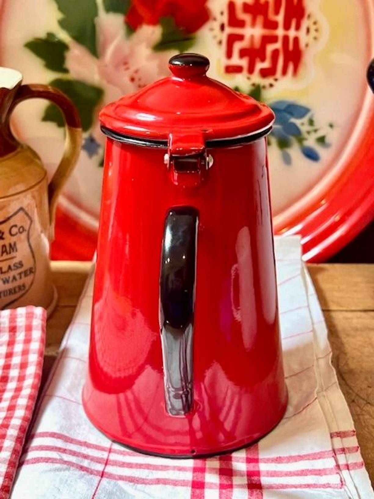 A pillar box red vintage enamel coffee pot with a hinged lid, a 2 pint/1 litre pot made in Poland. In excellent condition with a clean white interior, suitable for most hobs and wood burners too.