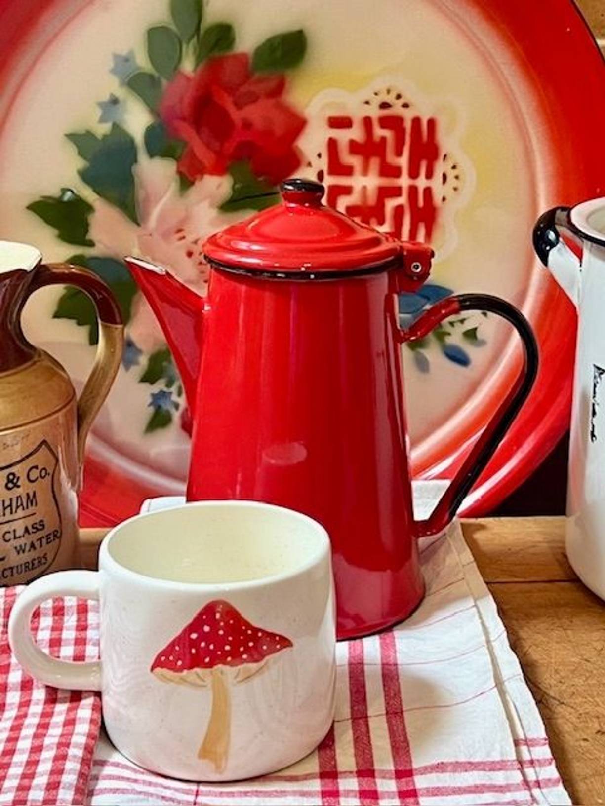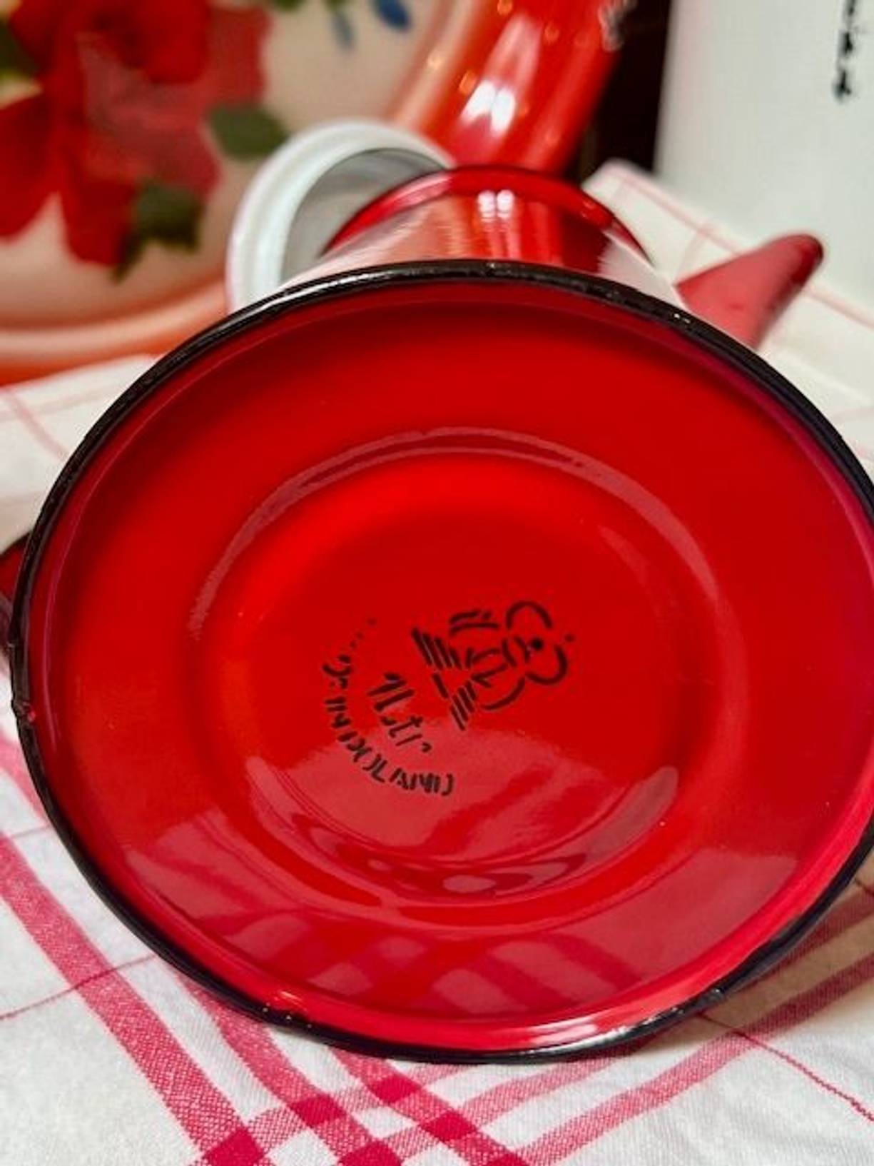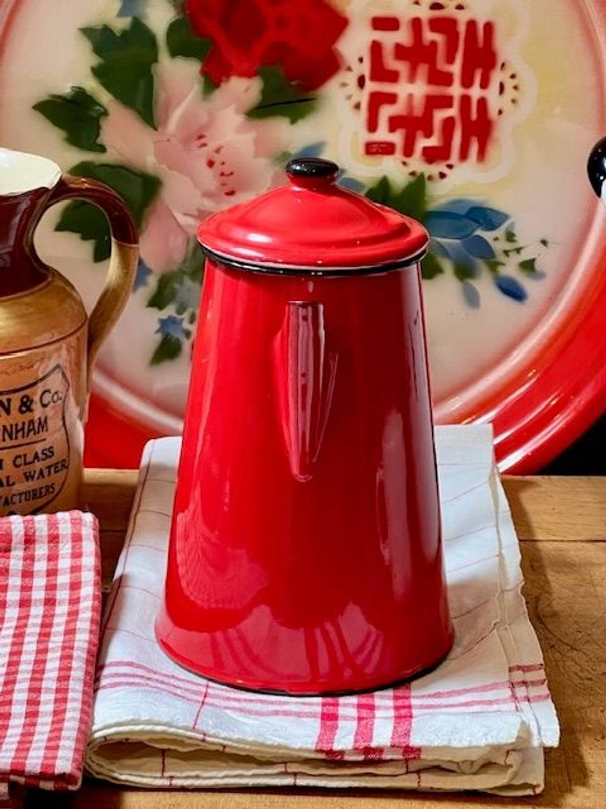 A pillar box red vintage enamel coffee pot with a hinged lid, a 2 pint/1 litre pot made in Poland. In excellent condition with a clean white interior, suitable for most hobs and wood burners too.